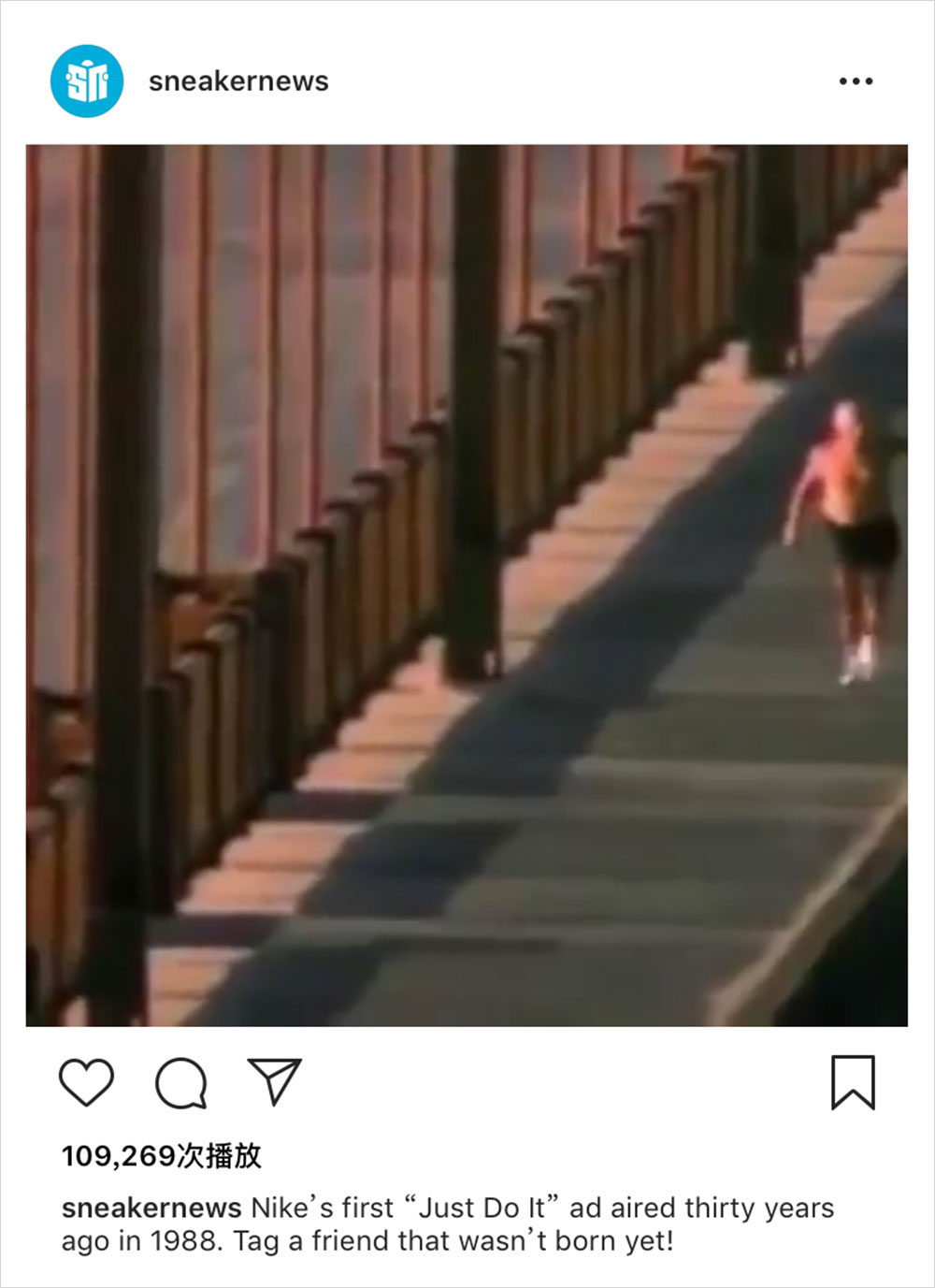 1988 年,Nike 发布了第一条广告片,同时也是 “Just Do It” 这句经典的标语第一次亮相于公众面前。在这条广告中,Nike 没有邀请火热的明星或是运动员,而是请到了一名 80 岁高龄跑者 Walt Stack ,视频中,Stack 裸着上身穿着运动短裤脚踩 Nike 运动鞋跑过了金门大桥。这样的桥段在 Stack 的生活中每天都在上演,并且一跑就是 17 英里,这样的运动精神显然更是 Nike 想要的,短短几十秒的广告,成为了 Nike 塑造品牌历史的开始。