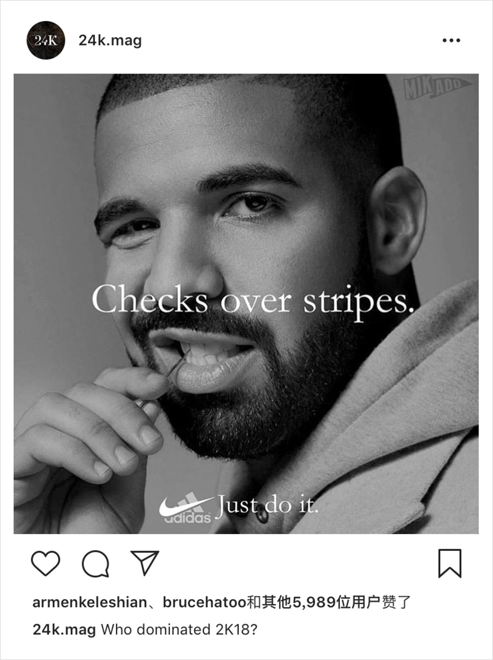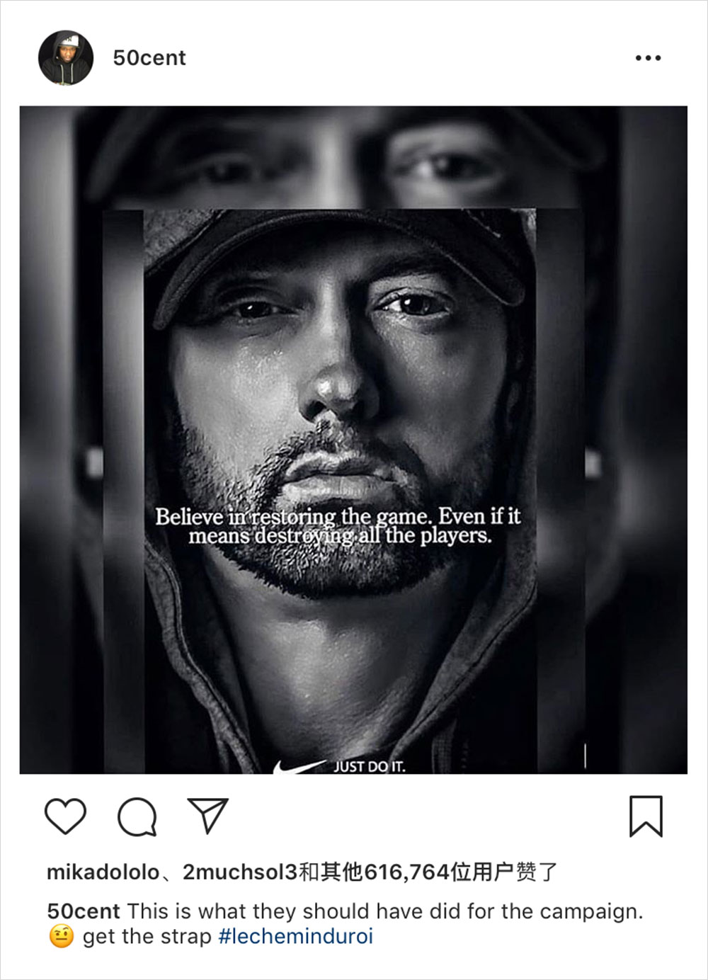 在昨日新闻中我们报道了网络上一张把 Nike “Just Do It” 30 周年广告主角替换成 Kanye 的恶搞图片之后,这样的恶搞在今日形成了一种趋势,Instagram 上开始出现更多人物的 “Just Do It” 30 周年广告海报,比如 Eminem 、Drake 、50 Cent 、以及拳王 Floyd Mayweather 。你喜欢哪一张?