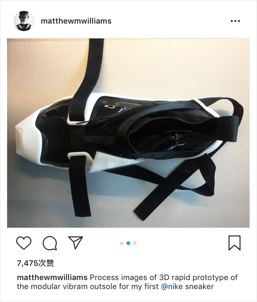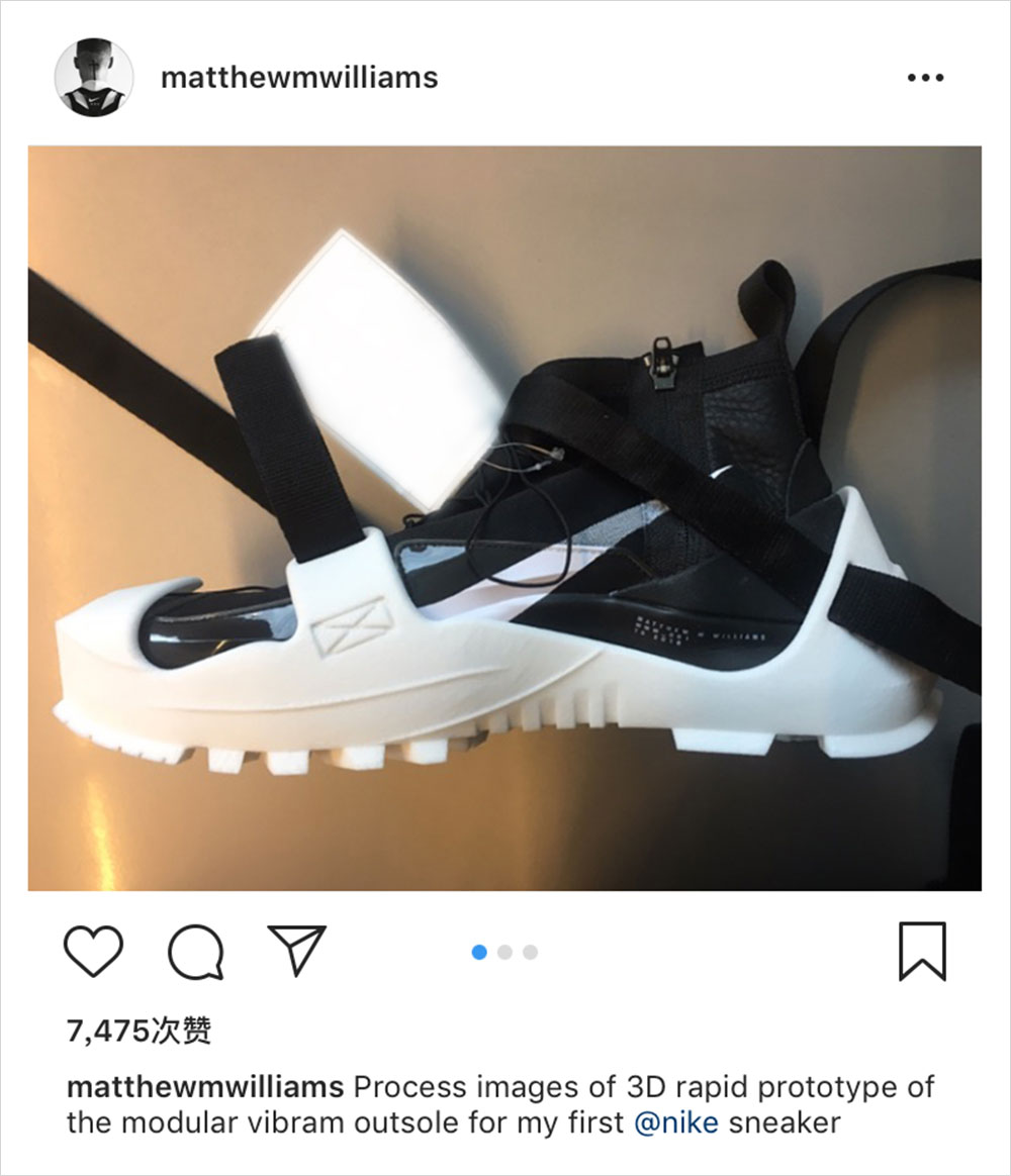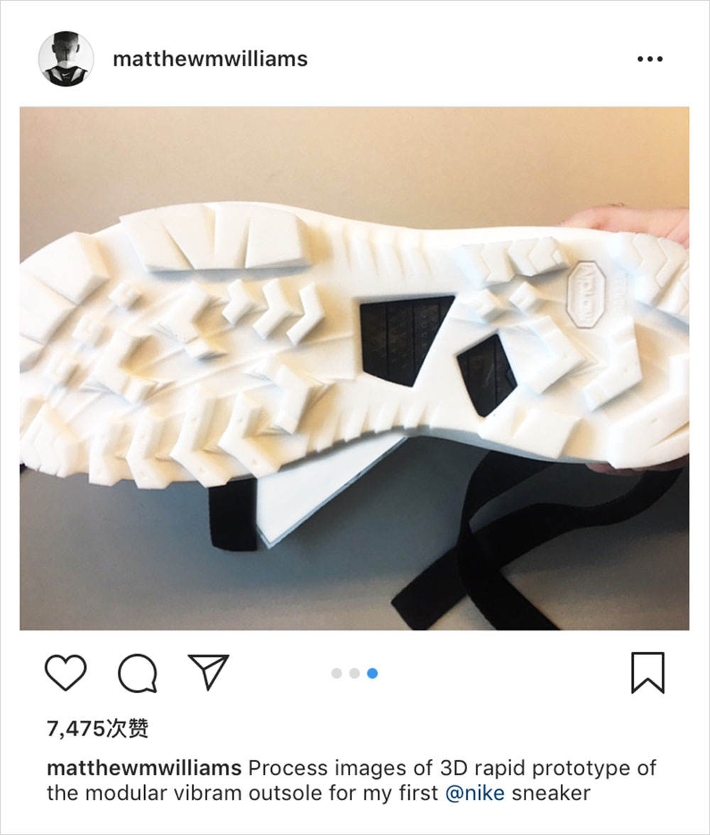 关于 1017 ALYX 9SM 设计师 Matthew Williams 与 Nike 的联名系列我们报道过不少,包括颇具机能风的鞋款。大家也都知道,双方联名的鞋款配色为纯黑色,但今日 Matthew Williams 的新动态似乎让我们看到了更多的可能性。如你所看,白色如 “盔甲” 般的外底包裹住了黑色的鞋面,相比纯黑色的版本也是不逞多让。但附文中却也提到了这只是 3D 的鞋底雏形,所以是不是新配色还得另说…