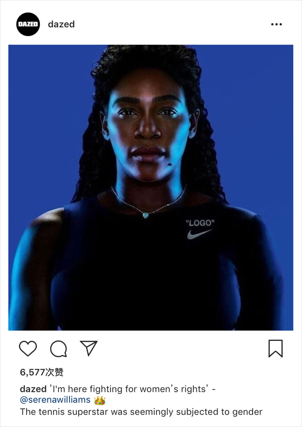 之前我们曾报道了网球冠军 Serena Williams 在比赛时穿着新战衣 “Black Panther” 却被法网批斗这一新闻,近日法网更是正式规定了这类战衣为比赛的 “禁衣” 。这一事引起了许多的争议,账号 @dazed 更是认为这是一种性别歧视,并且借此为女性发声。虽然当时官方给出的理由是该着装不尊重比赛和法网,但你们觉得这样的装扮真的会对运动竞技有所影响吗?
