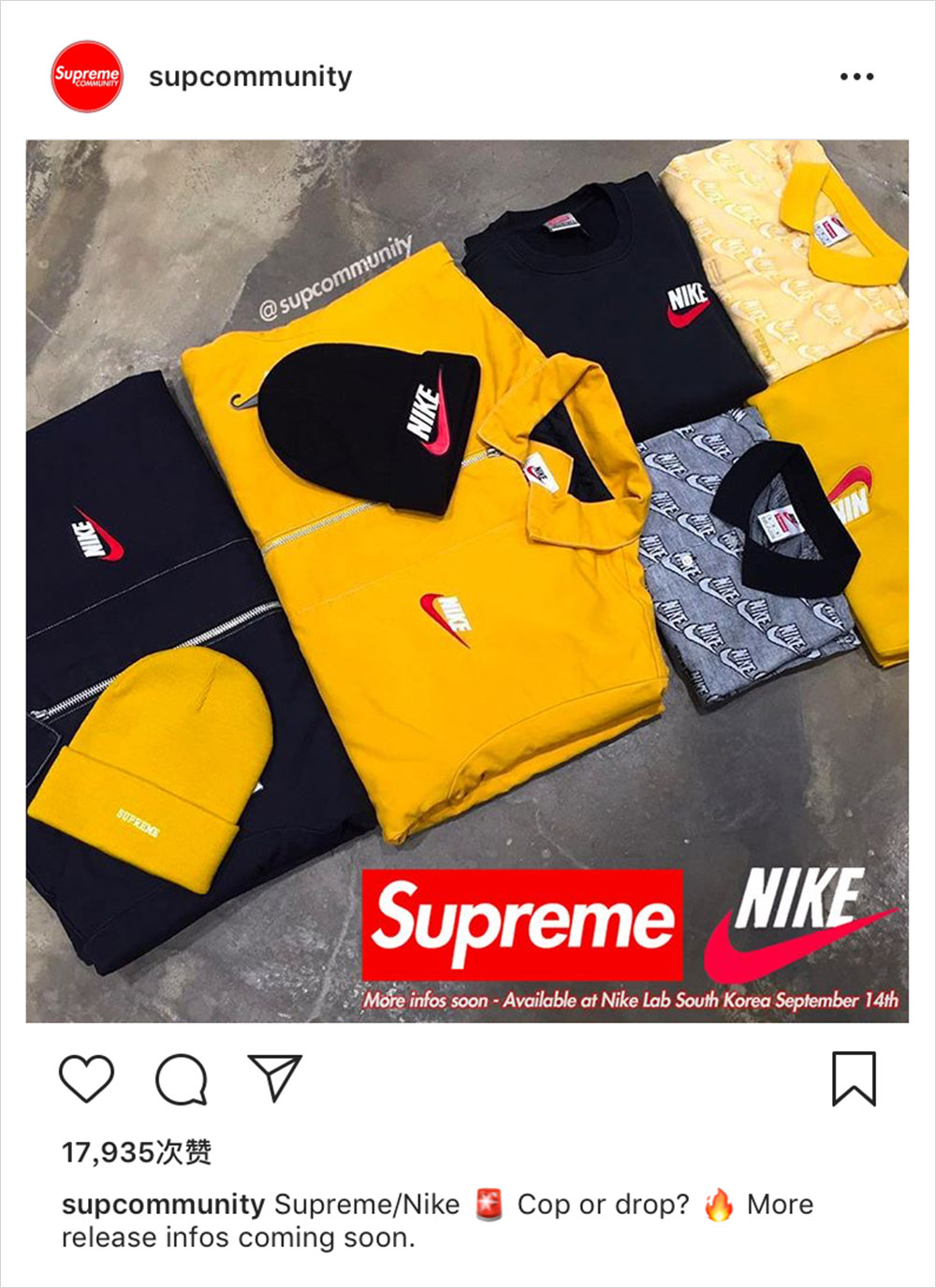 虽说本周迎来了 Supreme x COMME des GARÇONS SHIRT 联乘系列的发售,但一直飙升的炒价却让笔者 “心生怯意” … 如果你也有这样的想法,那不妨留意一下日前在 Instagram 上曝光的疑似 Supreme x Nike 最新联乘。从图中可以看到双方的最新联乘服饰以黑色和黄色作为配色基调,包含了厚款教练夹克外套、短 Tee 、Polo 衫以及毛线帽,风格略显复古。目前官方还未给出任何消息,想及时了解就继续关注我们的报道吧。