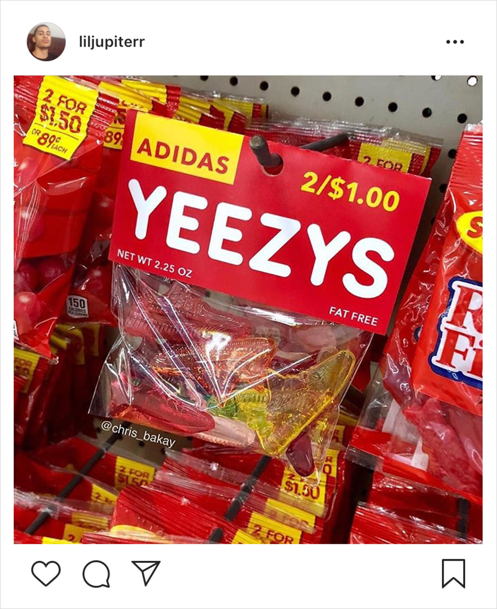 作为当下最火热的鞋款之一,似乎各行各业都想利用 Yeezy 的热度获取利益,近日,就有一家零食商这么做了。就像你看到的,“adidas Yeezy” 这两个品牌字样就这么被印在了包装上,而包装里的软糖零食也都是 Yeezy 350 的模样… 暂且不说产品是否有侵权嫌疑,反正我是挺有购买欲的…