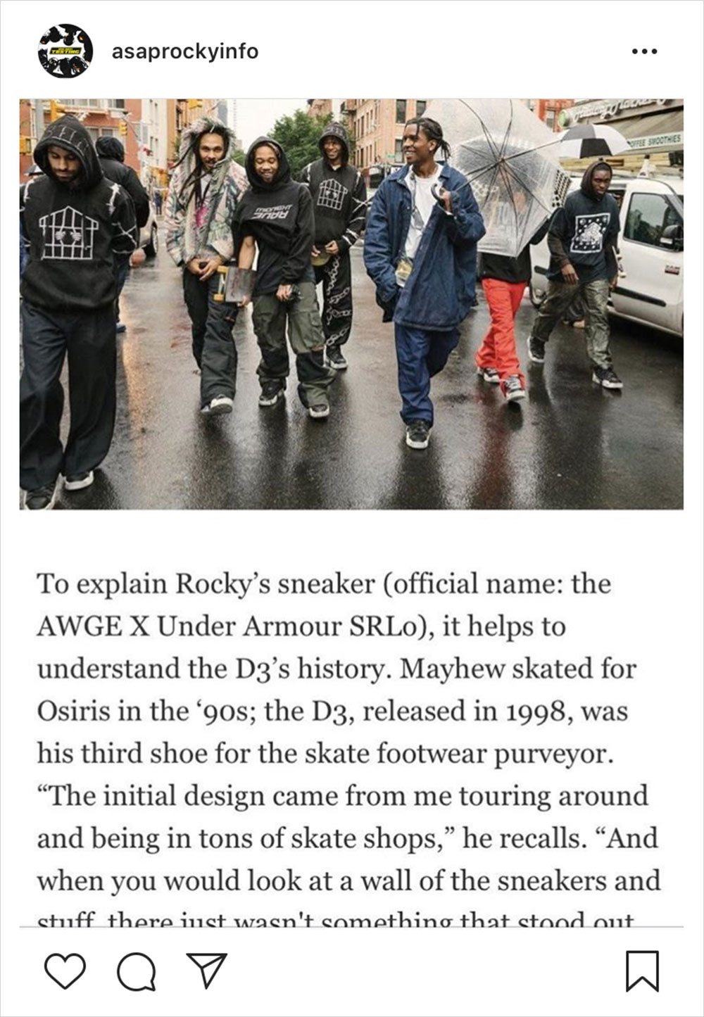 经过长时间的曝光和预热,A$AP Rocky x Under Armour 的联名鞋款 “AWGE X Under Armour SRLo” 终于在今日迎来发售。对此,GQ 就 Rocky “反传统主义者” 的身份问到,为什么会选择这么复古的一双鞋?原来,鞋款的设计原型来自经典滑板鞋 Osiris D3’s ,发布于 1998 年,Rocky 第一眼看到这双鞋的时候就表示非常喜欢,因为当时几乎没有任何鞋款与它相似,可也因此,这双鞋并不被大多数人喜欢。对此,Rocky 以 20 年为一个时尚周期,拿出 Demna Gvasalia 的 Balenciaga 、Raf Simons 联名鞋以及 Kanye 的 Yeezy 等这些火热鞋款比喻到,这些鞋款带火了复古风,也导致现在人们对于好看鞋款的定义是它的鞋底有多大、是否复古… 而从这个角度来看,Osiris D3’s 比它们早了 20 年。最后,Rocky 用一句话总结了他的设计概念,“就像是你买了一台老式电视机或者街机游戏,而我做的只是翻新它” 。