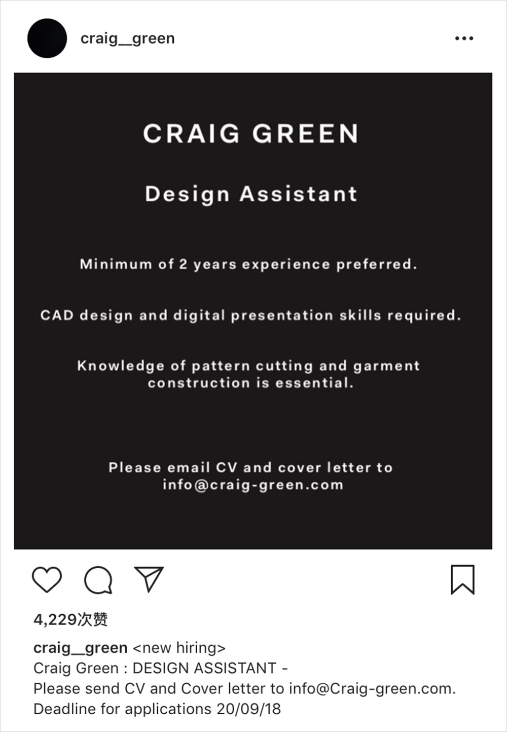 大多数设计师都会需要一名设计师助理,而在知名设计师助理身边学习更是不少人挤破头都想把握的机会,却奈何没有什么渠道。但今日鬼才设计师 Craig Green 就广而告之的在 Instagram 上招聘设计师助理,除了 CAD 等硬件要求外,还要对服装的剪裁和结构有一定的见解。邮箱已经给你们了,试试?