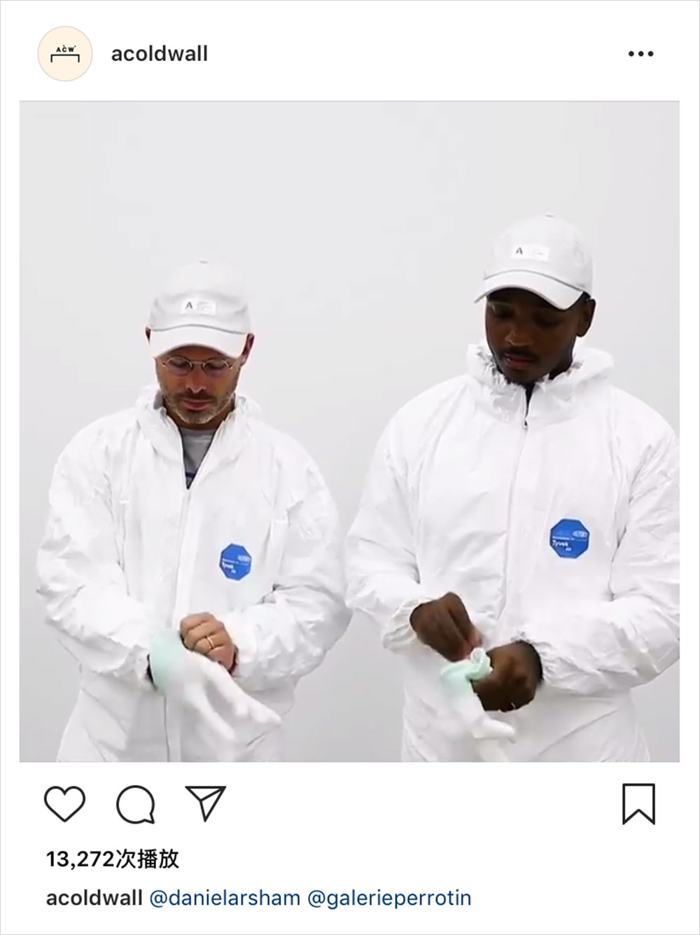 纽约艺术家 Daniel Arsham 近日与 A-COLD-WALL* 主理人 Samuel Ross 联手打造全新的概念艺术展以及一系列工业服饰。熟悉 A-COLD-WALL* 的朋友都知道,“工业” 简直就是这个品牌的属性,这一点与 Daniel Arsham 所呈现的艺术视觉不谋而合,合作自然也是水到渠成。可以看到视频中所有人都穿着双方的联名制服,“白大褂” 般的服饰上刺绣了 A-COLD-WALL* 和 Arsham Studio 的品牌 Logo ,并喷上 Arsham Studio 标志性的绿色喷漆点缀。可惜的是,此次合作仅为突出概念并通过展览展示,所有作品不会市售,大家就安心看看两个 “工业” 玩家碰撞擦出的艺术火花吧。