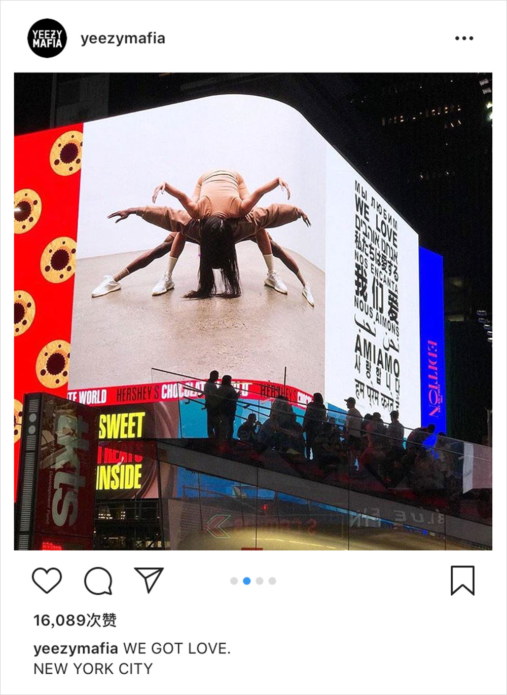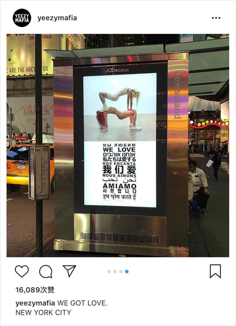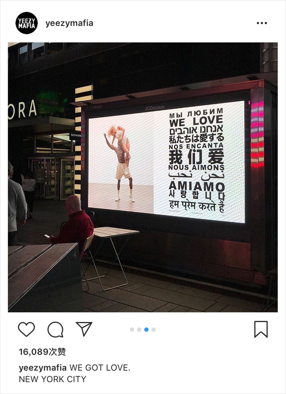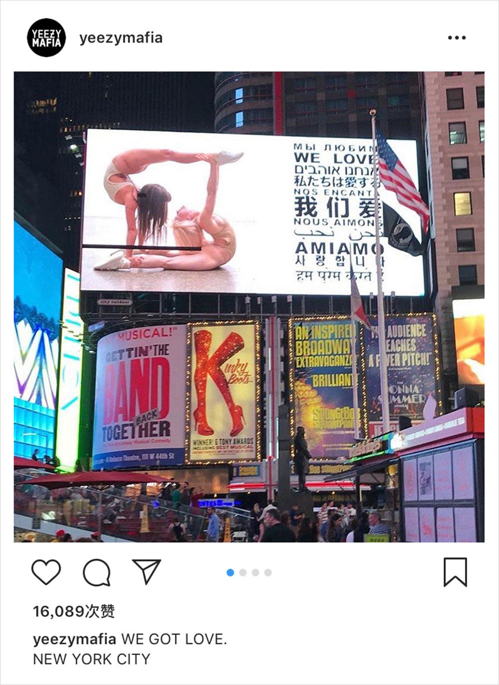 前几天 Kanye 为了给 9 月 21 日发售的鞋款 Yeezy Boost 350 V2 “Triple White” 做宣传,拍摄了一组特别的 “人体雕塑” 造型 Lookbook 。今日,为了加大鞋款发售的造势,Kanye 还将这套造型在纽约市中心呈现,并使用包括中文字在内的多国语言表达了型录的主题—— “我们爱” 。各种夸张惹眼的造型在人来人往的市流中一定非常吸睛,相信此举也会加大这双鞋的销量吧?