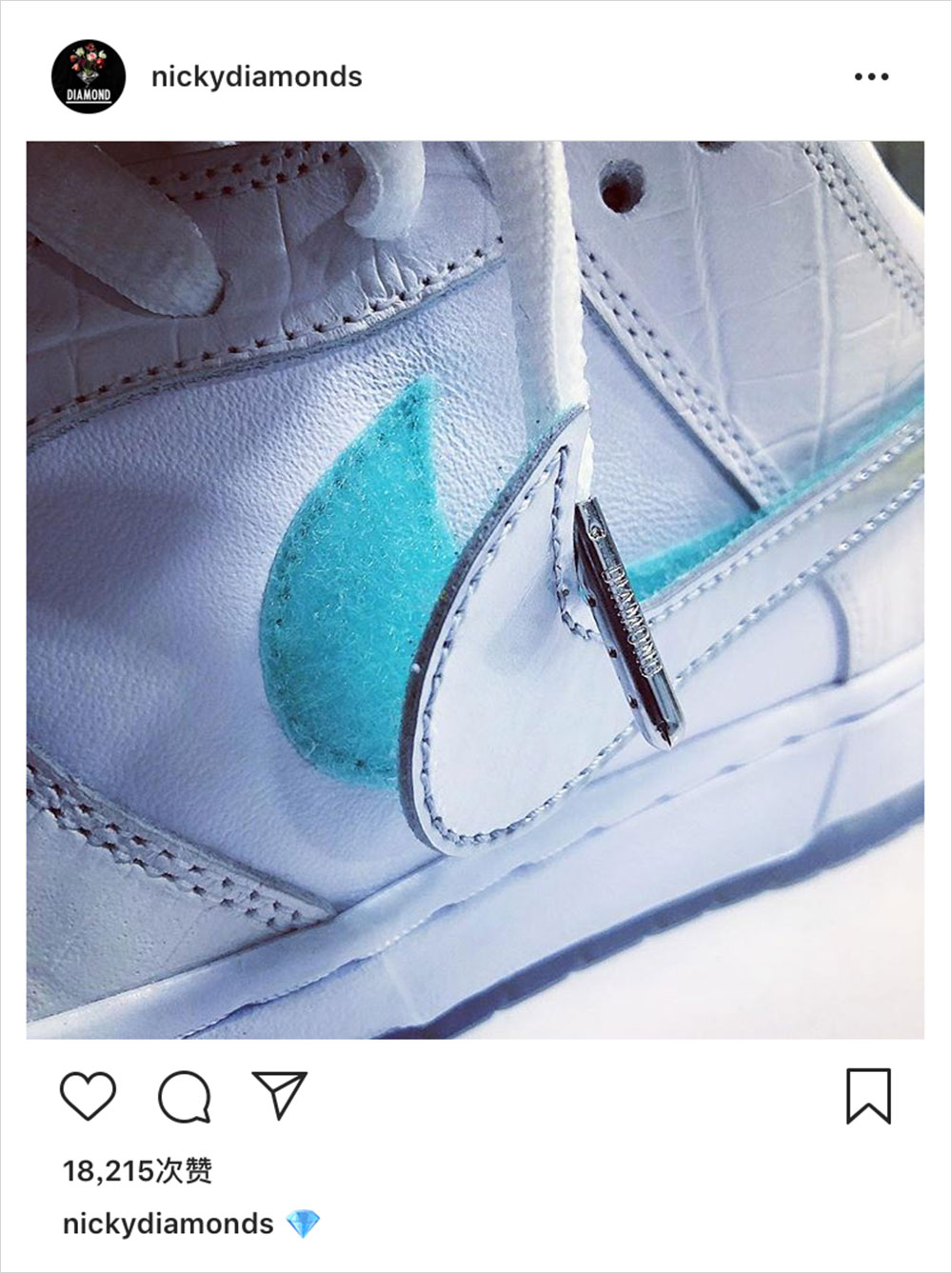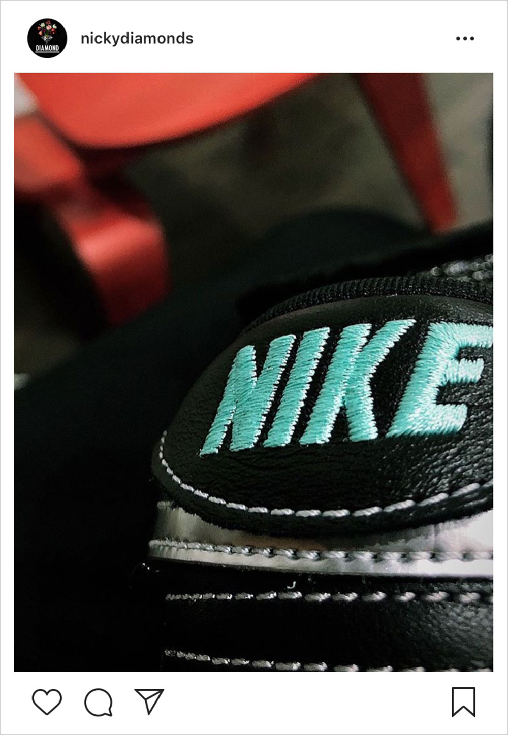早在 9 月 9 日 Diamond Supply Co. 主理人 @nickydiamonds 就曝光了一张鞋款细节谍照——黑色材质上刺绣着辨识度极高的 “Tiffany” 蓝色 “NIKE” 字样。鞋迷们立马就顿悟双方这是又要发布联名鞋款了!而今日主理人再次以同样的 “手法” 曝光了联名款的新配色以及更多鞋款细节,例如金属鞋带头刻有的 Diamond 字样以及 Swoosh 可拆卸分离的功能。