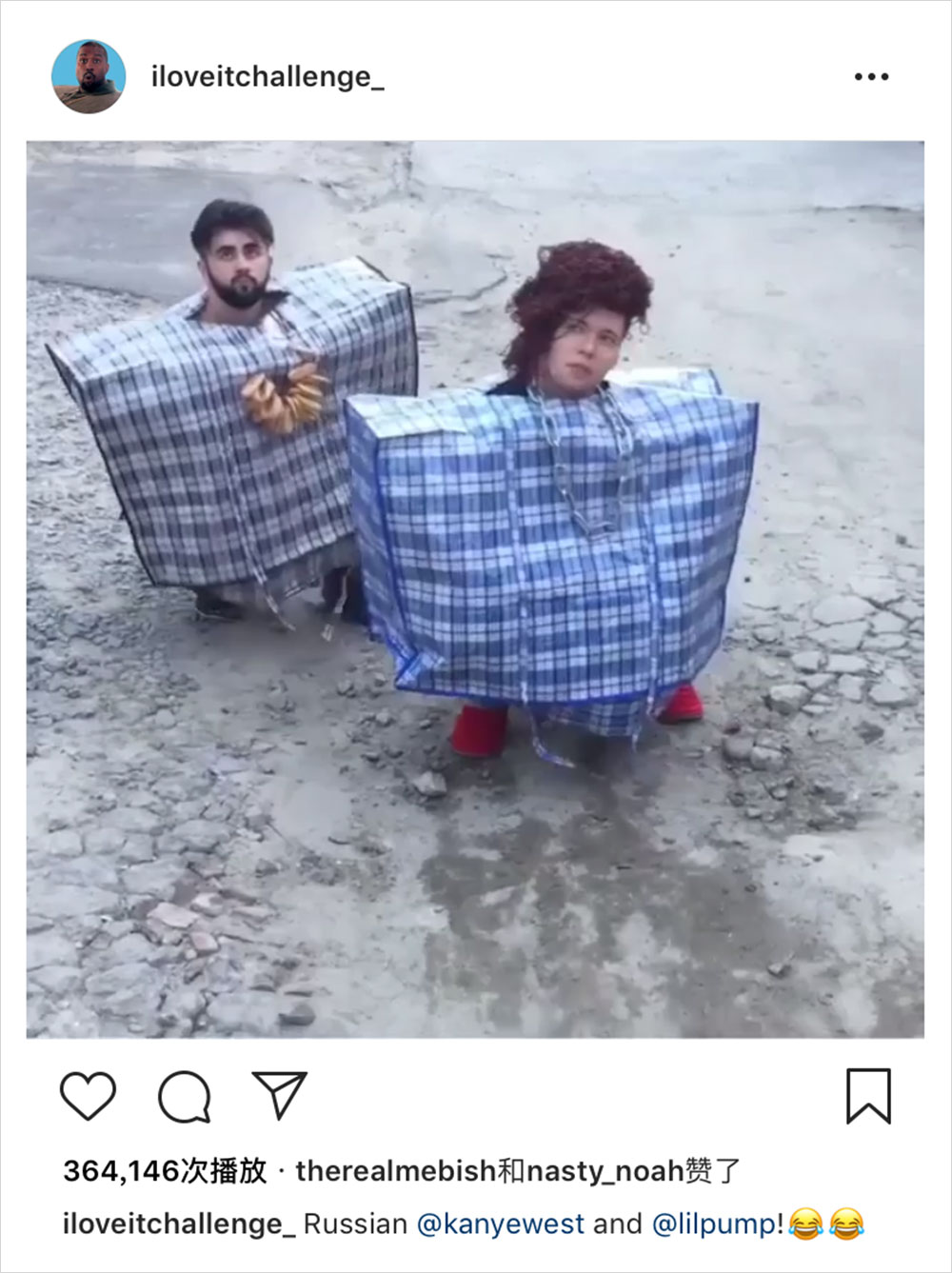 经常关注我们报道的朋友应该知道,Kanye West 和 Lil Pump 合作的单曲《I Love It》成为了史上在 YouTube 单周点击量最高的 Hip-Hop MV 。这数据的背后,是网络上各路名人就 MV 中的造型进行的 Challenge ,就连知名主持人 James Corde 都参与了这波潮流,如果你也喜欢这个 MV ,不妨也试试自制一套?要知道,甚至装衣服的麻袋都能用于造型的模仿…