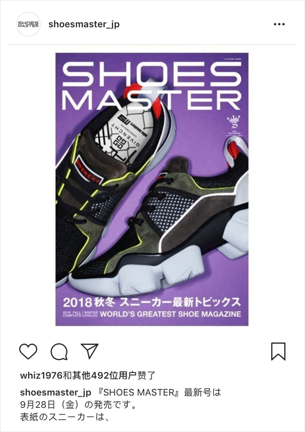 大家平常一定很少见到老牌时装屋和潮流鞋铺展开合作吧,可就像你看到的,在 9 月 28 日的《シューズ・マスター マガジン》 (SHOES MASTER)杂志封面中,就出现了 Givenchy 联手日本潮流鞋店 mita sneakers 打造的一双 Chunky Shoes ,在鞋垫和鞋舌处都可看出双方的品牌 Logo 。可以说非常吸引人,想要了解更多的话届时大家也去买一本吧。