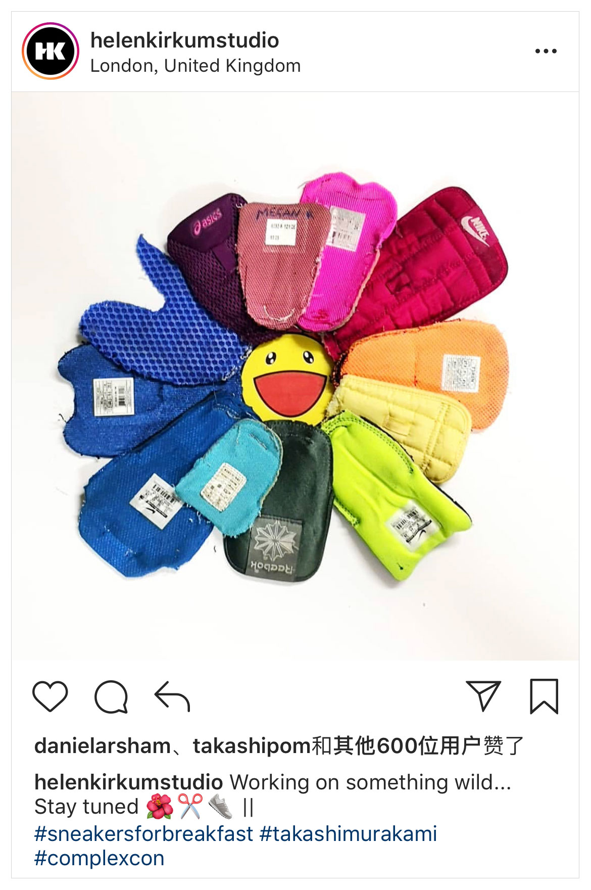 以解构设计见长的球鞋设计师 Helen Kirkum 继续在 Instagram 上创新想法,将许多五颜六色的鞋舌拼在一起,以构成艺术家村上隆的标志性作品之一。不过从附文来看,貌似这位设计师只是展示想法,其实还有下一步的动作?看来我们还是持续关注吧。