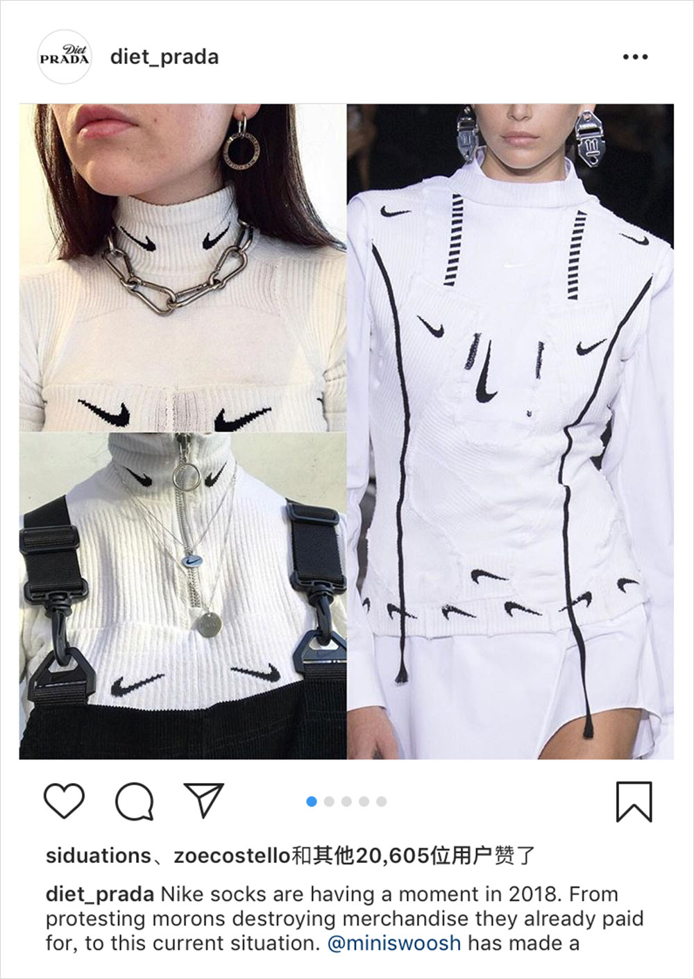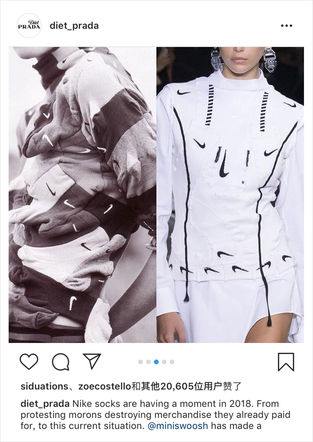 自 Off-White™ 在巴黎时装周发布 2019 春夏女装系列之后,时尚警察 @diet_prada 也是没闲着,今日就这次走秀的产品发表了自己的 “调查报告” ,就像你看到的,走秀中 Off-White™ 与 Nike 的白色联名上衣被指灵感取自喜欢改造 Nike 产品的设计师 MiniSwoosh™ 的一款高领上衣,附文中提到 MiniSwoosh™ 的设计可能也是来自于 1991 年一个经典的改造例子,但时尚警察认为, Virgil 此举真的是验证了他只更改 “3%” 的设计手法。