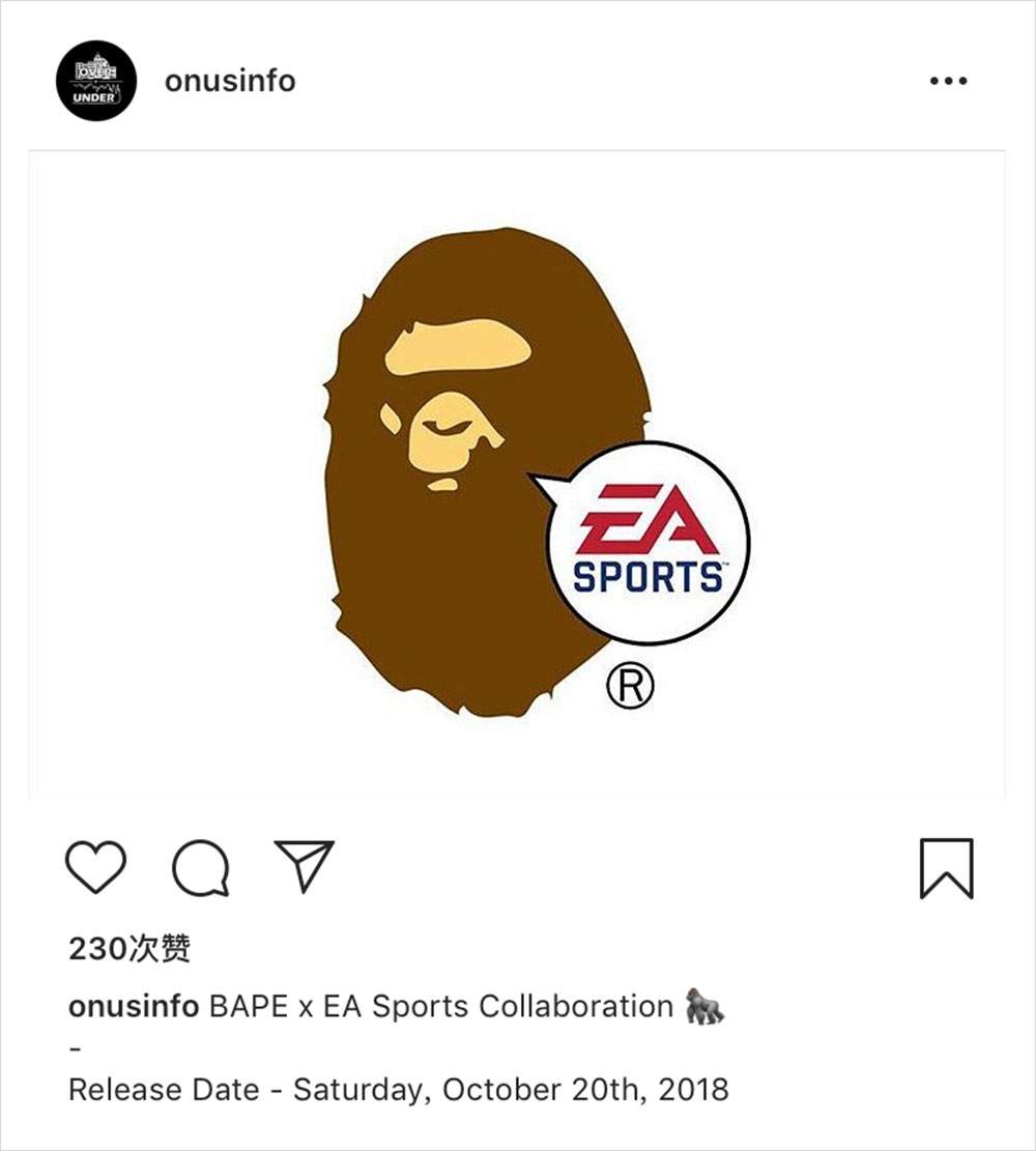 不久前我们在本栏目报道了 BAPE® 与《绝地求生》展开合作的消息,玩家可在游戏中随处可见 BAPE® 的品牌印记。近日,Instagram 又曝出 BAPE® 将与另一游戏巨头 EA Sports 的联名动态,虽说联名的完整详情在 10 月 20 日(明日)正式发布,但借鉴 BAPE® x《绝地求生》的合作,或许也是在游戏服饰上做文章,想第一时间知道具体的内容就持续关注我们的报道吧。