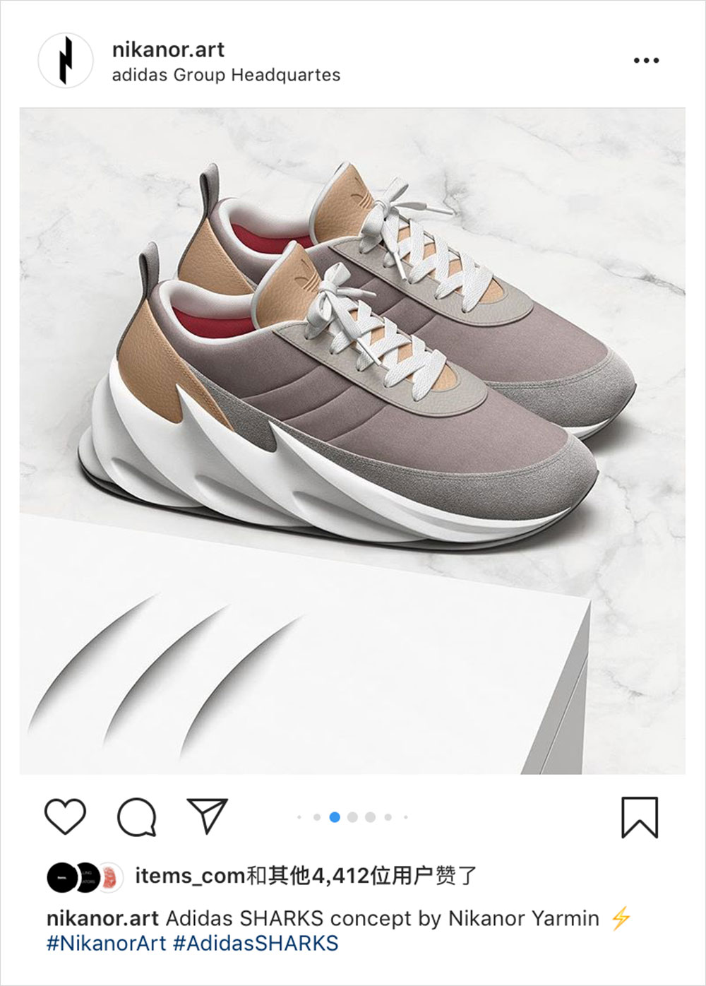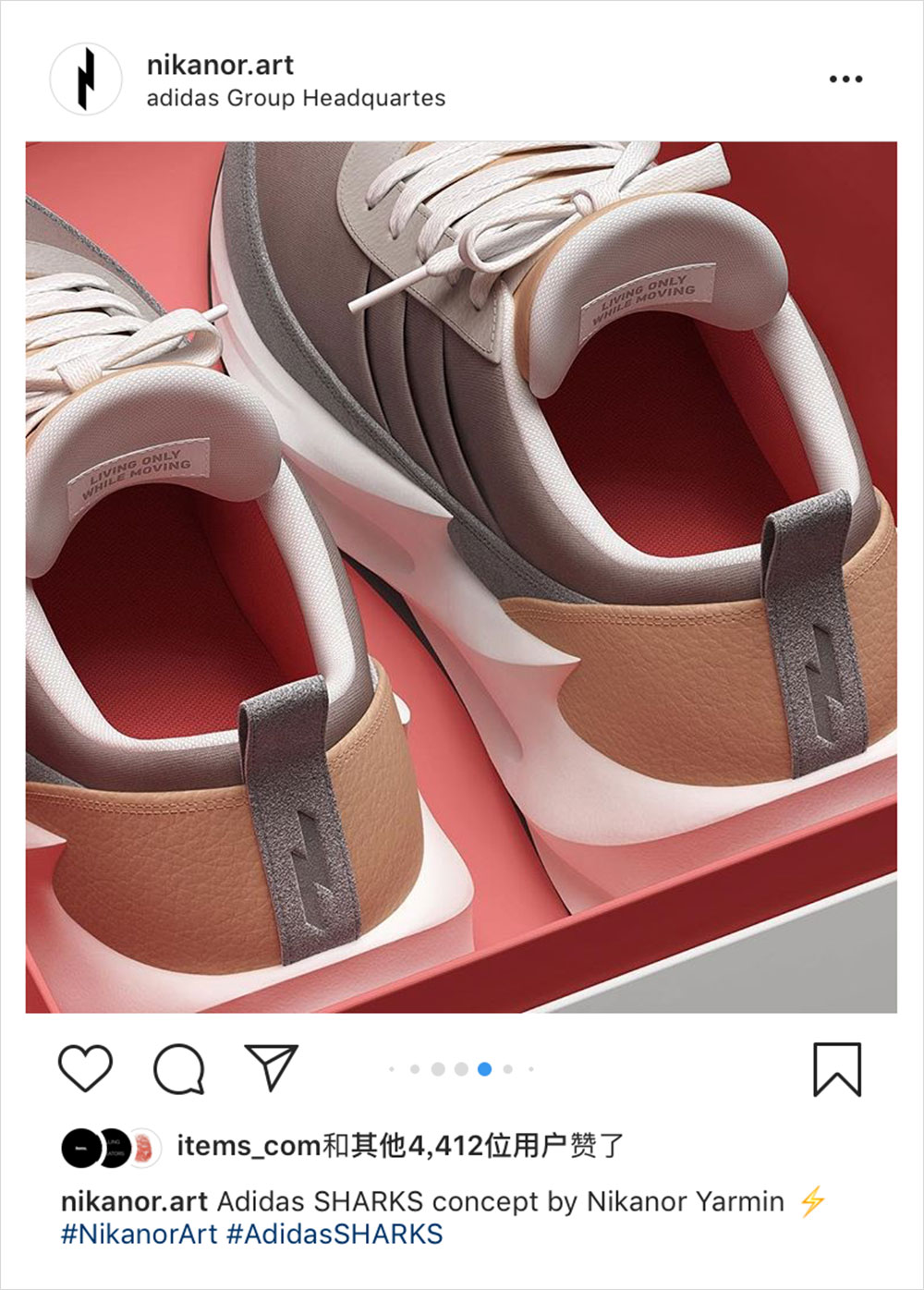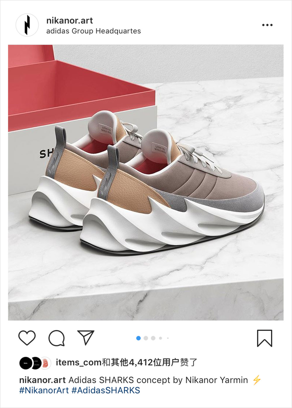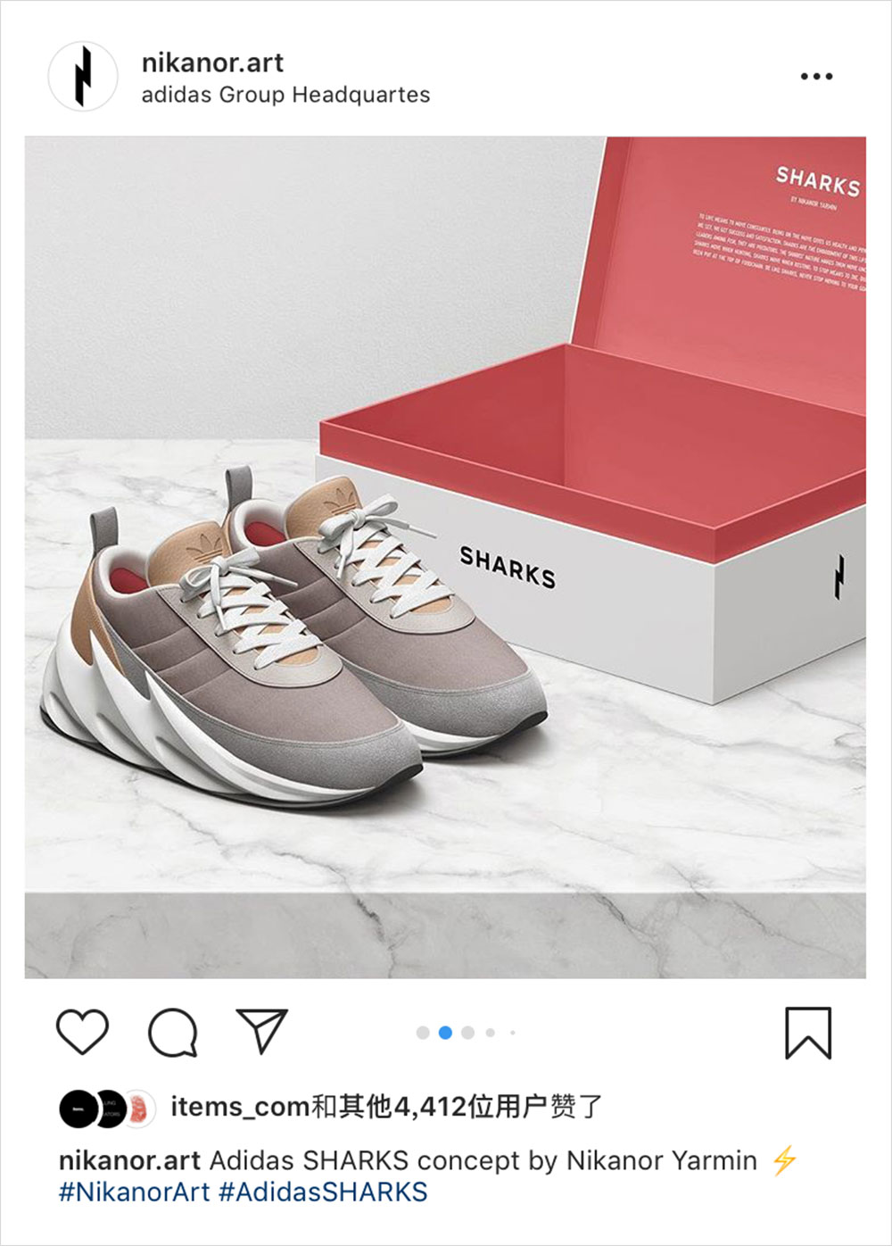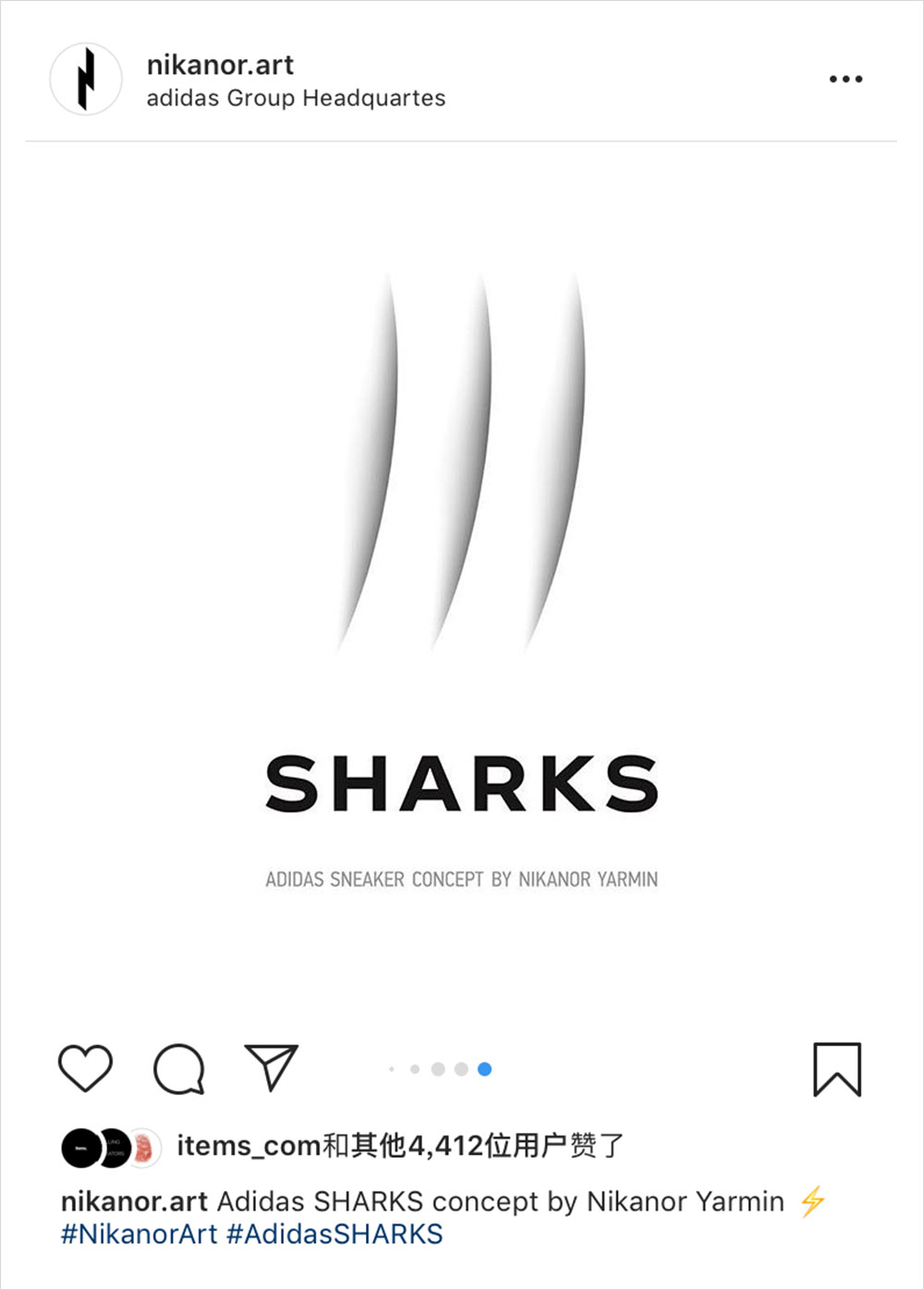 对于 adidas 的球鞋创意我们在这个栏目报道了不少,但大多数的设计都是在外形上做文章,而今天要给到大家的球鞋创意,则是将更多的放在了功能上,而设计的来源就是鲨鱼的生存原则—— Living only while moving(只在移动中生存)。概念鞋款 “SHARKS” 在色彩上也是取自鲨鱼的体表色彩,鞋侧的品牌三条杠则设计成了鲨鱼的鳃,当你穿着这双鞋行走造成的弯曲会使侧面的 “鳃” 开放,形成额外的通风,鞋中底的波纹就像鲨鱼在水面快速游动的场景,可以说很形象了。自古以来人类就不停的从动物身上获取发明的灵感,这一点在球鞋设计上也同样如此。