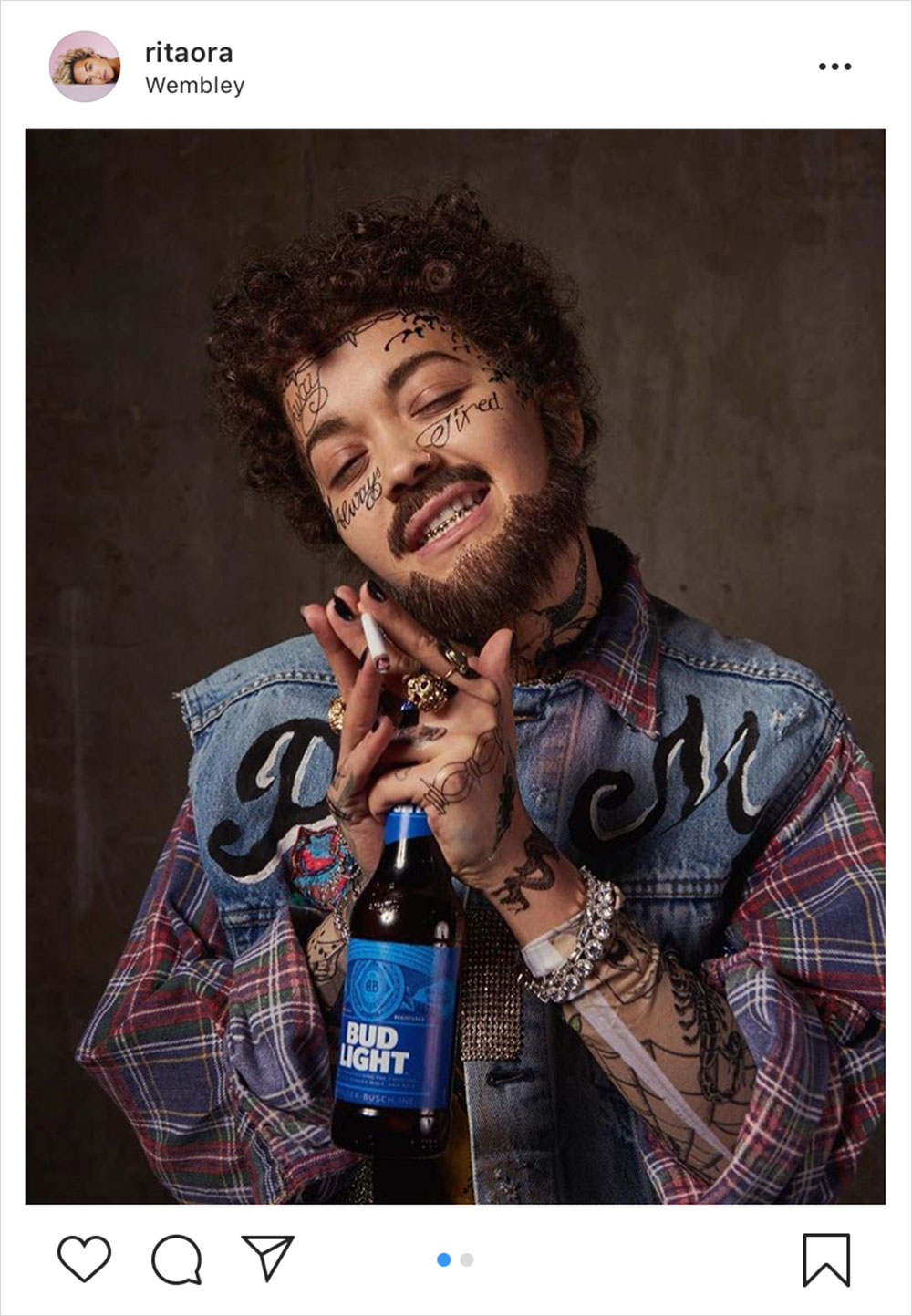 很明显,英国女歌手 RITA ORA 模仿的是 Post Malone ,粉丝身份显露无疑