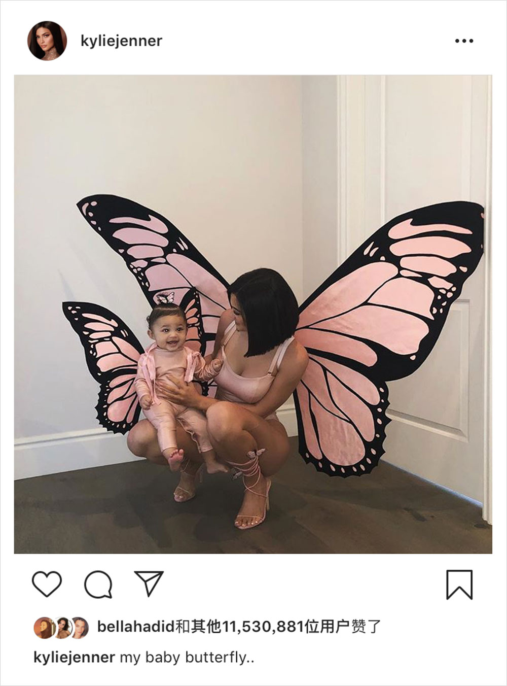 Kylie Jenner 则是携女儿一起 Cos 了一番蝴蝶仙子,温馨有爱…