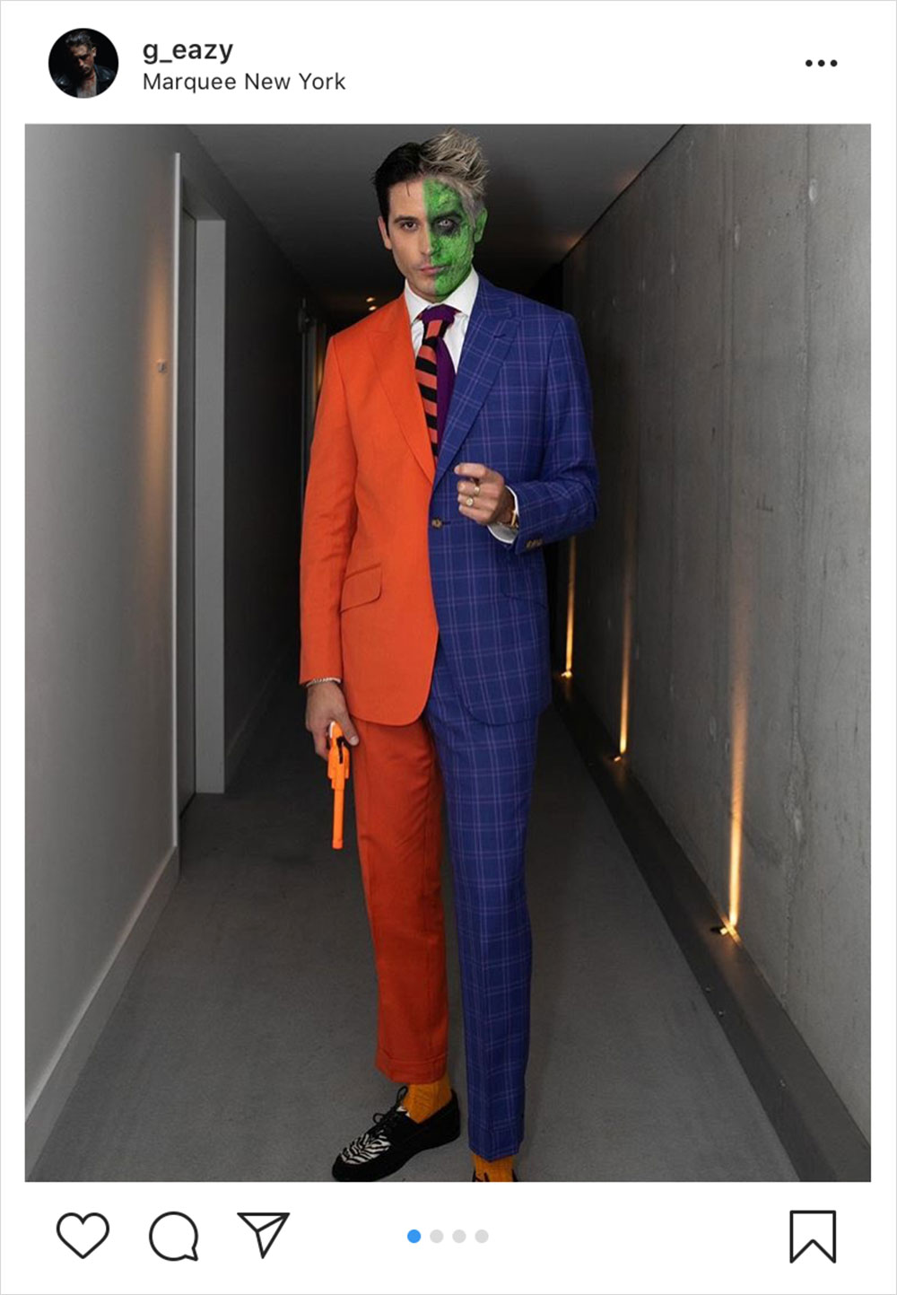说唱歌手 G-Eazy 将自己打扮成了《蝙蝠侠》里的反派人物双面人,非常形象了…