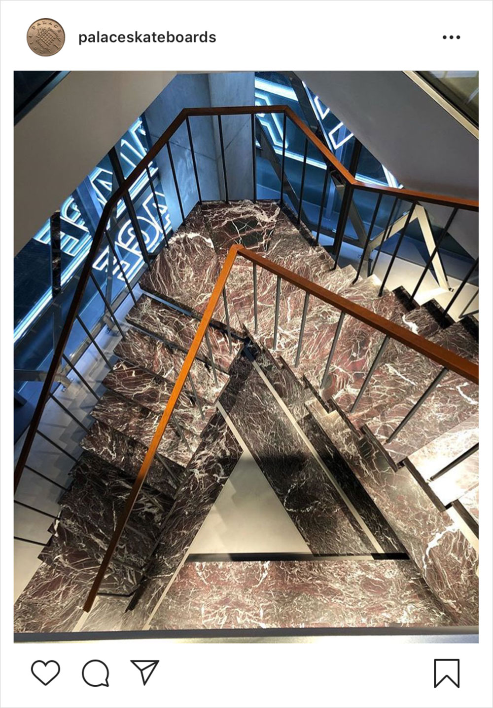 PALACE 进军亚洲在东京开设全新店铺这一消息想必大家都知道了,我们也及时报道了东京店的独家限定。但对于店内实况,大家都还不了解,今天官方账号晒出的店内一角还是让人为之惊叹,虽然没有很明显的日本风格,但是透过石纹的回转楼梯呈现 PALACE 的品牌 Logo 这一手法,还是足以见证品牌对新店的用心之处。