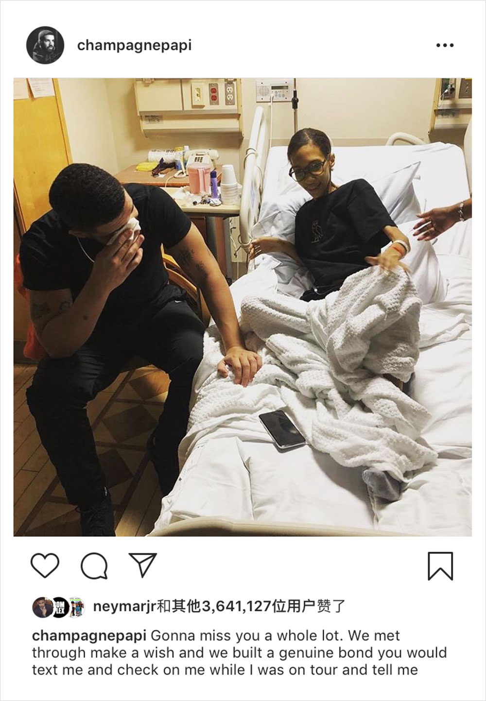 日前 Drake 发布了一张看起来有些许感人的照片,记录的是 Drake 曾经来医院探望的一名年轻的患病女孩,然而 Drake 通过照片表达的含义却是令人叹息的,因为这位小女孩已经离开了人世了… 据了解,Drake 是通过基金会认识到的小女孩,两人会时常互发短信鼓励对方,从附文中 “我们能建立起了真正的友谊” 就可以看出 Drake 对这名女孩的重视,原本 Drake 期待着巡演结束后再次探望小女孩,可惜也没有了机会。 其实这不是 Drake 第一次如此身体力行关心粉丝了,在早期的《墙外世界》中,Drake 就现身医院探望一名名叫 Sofia 的小女孩,仅因为能见 Drake 一面是这个小粉丝的生日愿望…