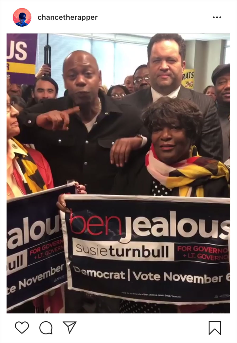 上个月 Chance the Rapper 就曾发推告示自己要竞选市长的消息,一开始仅是通过歌词暗喻,随后便直接地说要为芝加哥市长竞选开设媒体发布会了… 这不禁让人汗颜,因为除了音乐,Chance 在政坛上也要追随 Kanye 的步伐… 然而在最近的市长选举中,Chance 并没有如一开始说的那样去参与竞选,反而呼吁大家给一位名为 Ben Jealous 的政坛人物拉票… 原来,Ben Jealous 非常重视黑人权利,并且力排种族歧视,所以赢得了许多黑人的尊重,在拉票视频中更有人说出,让他当选,Hip-Hop 就不会停止的话… 对此,笔者想说的是,如果要建议一个 Hip-Hop 之城,Chance the Rapper 你参与竞选不就好了?