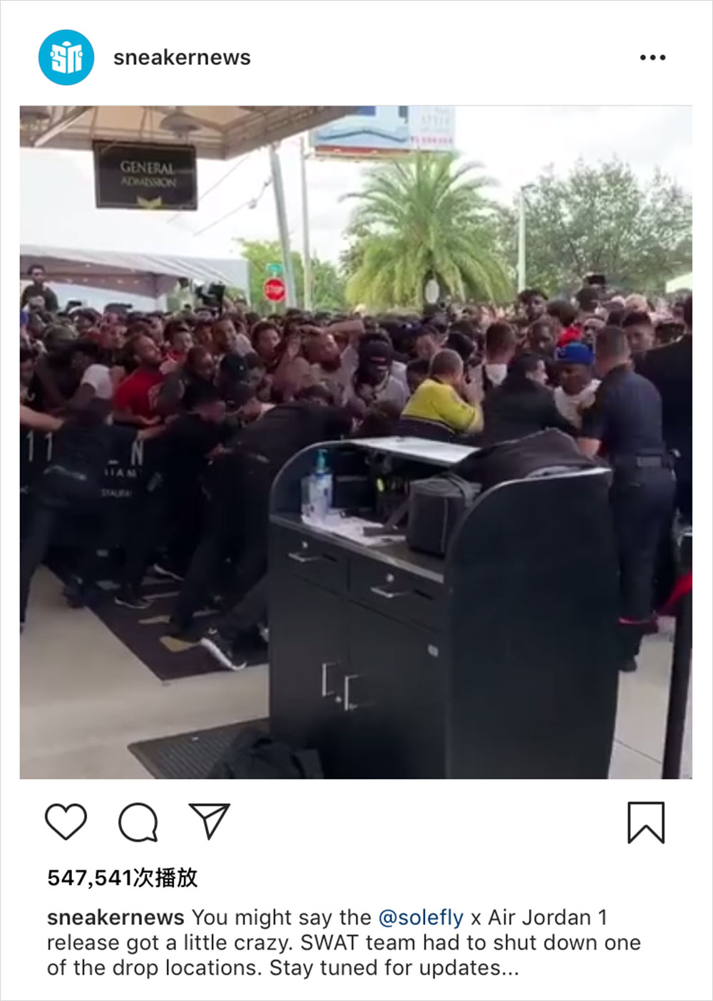 前几日 SoleFly x Air Jordan I 在迈阿密进行了发售,这双早前就由 DJ Khaled 最先曝光又经历一番预热的鞋款自然受到了鞋迷的热捧,但似乎也热情过了头… 点开视频可以看到,发售现场的排队状况十分混乱,负责维护秩序的安保人员甚至出现了拦不住的状况,为了安全,迈阿密警方勒令取消了这一次的发售… 还是那句话,安全第一。