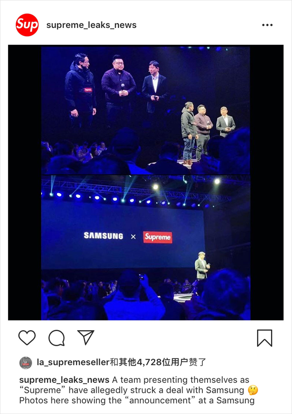 今年 6 月份我们在《墙外世界》里报道了一篇假 Supreme 在国内举行合作发布会的丑闻,这事还传到国外去并引起了一片哗然… 但和今天发生的新闻比起来还有点小巫见大巫了,因为在新的一出山寨 Supreme 联名里,对象是科技巨头三星… 据悉,联名的公布是在全新手机 Galaxy A8s 的发布会上,更是出现了自称 Supreme 品牌 CEO 的人上台讲话,并道出了将于北京三里屯开设 7 层楼实体店铺的计划。这番 “合作” 在了解潮流的你们眼里自然是场闹剧,虽然事后三星也给出了 “我们合作的是 Supreme 意大利品牌” 的回应,但和一个 “抢注” 的山寨品牌合作,网友们真的会买账吗…