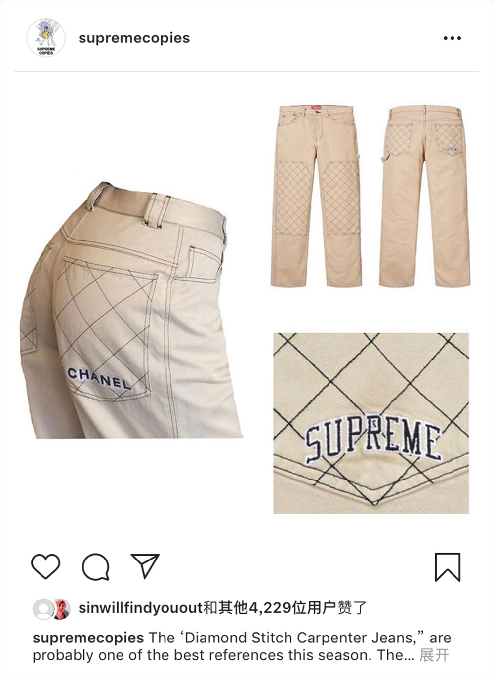 “Diamond Stitch Carpenter 牛仔裤” 是本季 Supreme 发布的单品,而专门曝光 Supreme 设计借鉴来源的账号 @supremecopies 今日就指出此单品的来源。如图中展示,左边为 Chanel 的一款裤子,Supreme 绣在裤袋位置的 Logo 以及压线效果都与其极为相似,该账号还表示:“虽然看不到 Chanel 这款裤子的正面,但可以肯定也有着和 Supreme 一模一样的网纹设计。” 其实就算是真的,Supreme 此举对你们来说也是见怪不怪了吧。