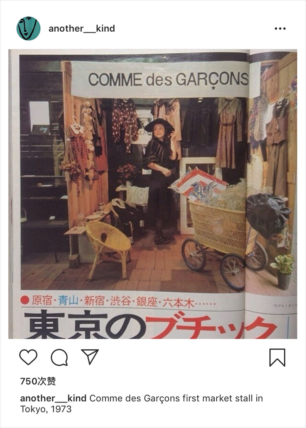 COMME des GARÇON 自 1973 年创立以来,有关 “川久保玲式” 的审美讨论就从未停歇。但在那个时候还没有网站、电商等等便捷的购物途径,实体销售是唯一的贩售渠道。如图中展示,COMME des GARÇON 第一家实体店不过是个一个小小的货摊,真的令人感慨,那时谁能想到,几十年过后的 COMME des GARÇON 会成为现在这个样子了…