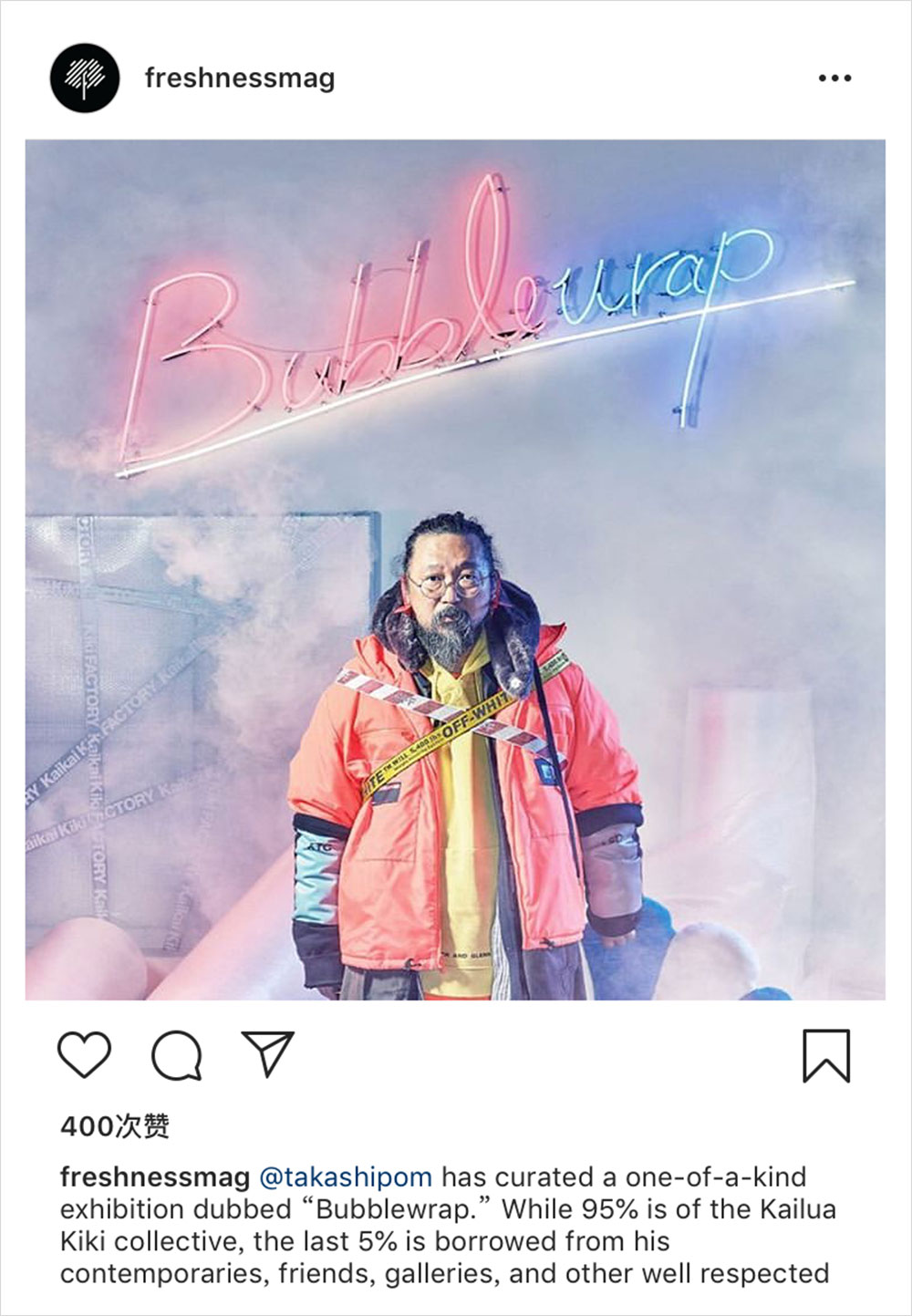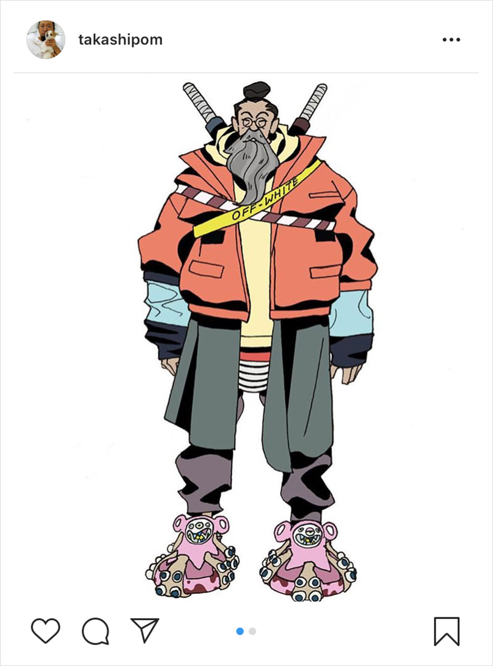 村上隆在近日策划了一个名为 “Bubblewrap” 的艺术展,多数展示 Kailua Kiki 的作品。近日就有网友 @uptwn 将村上隆该展览的宣传照绘画成了漫画形象,并结合了一些他的作品加以点缀,眼尖的朋友可能还会发现他身上的 OFF-WHITE 织带…对于这个动漫形象,你觉得它够传神吗?