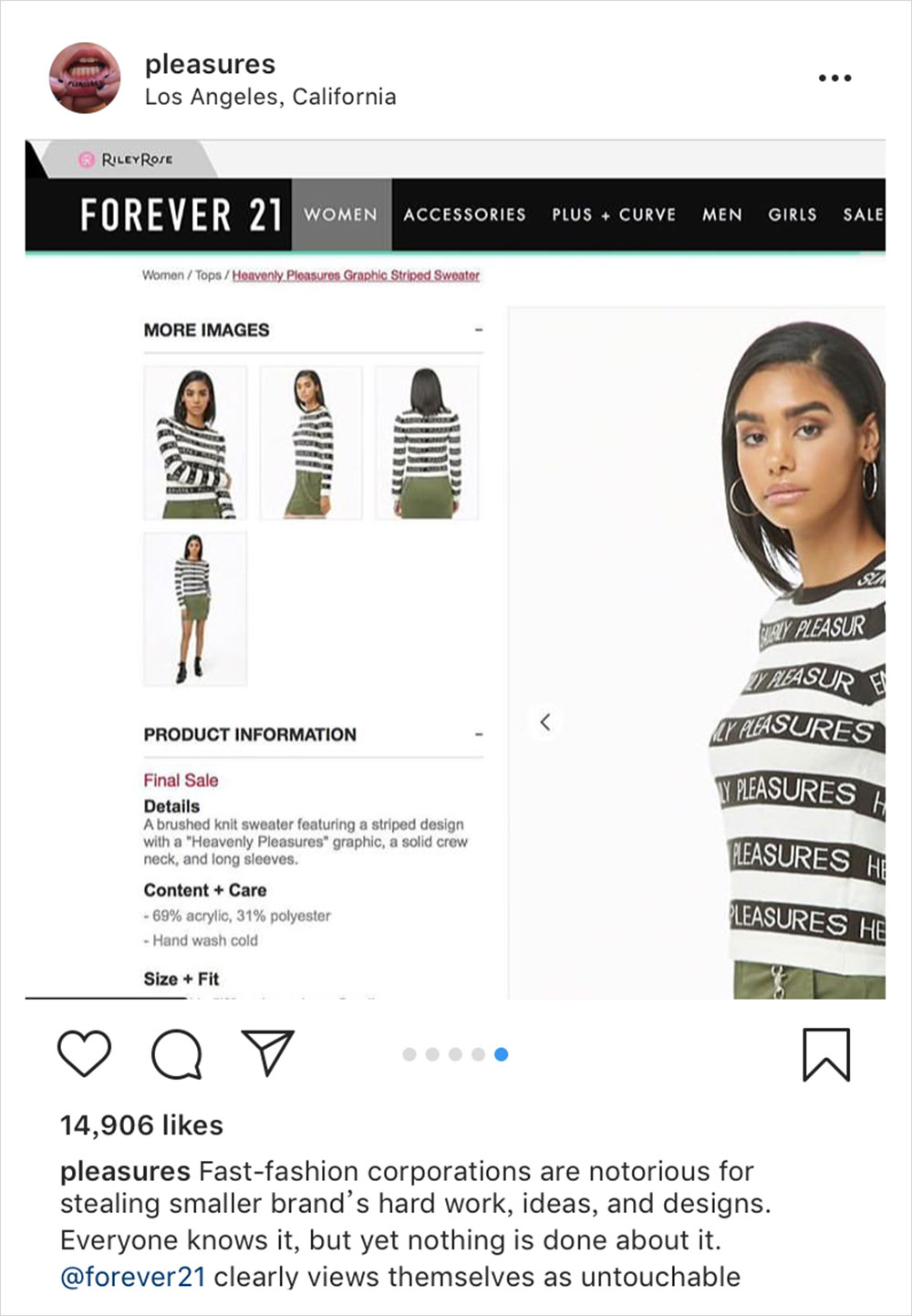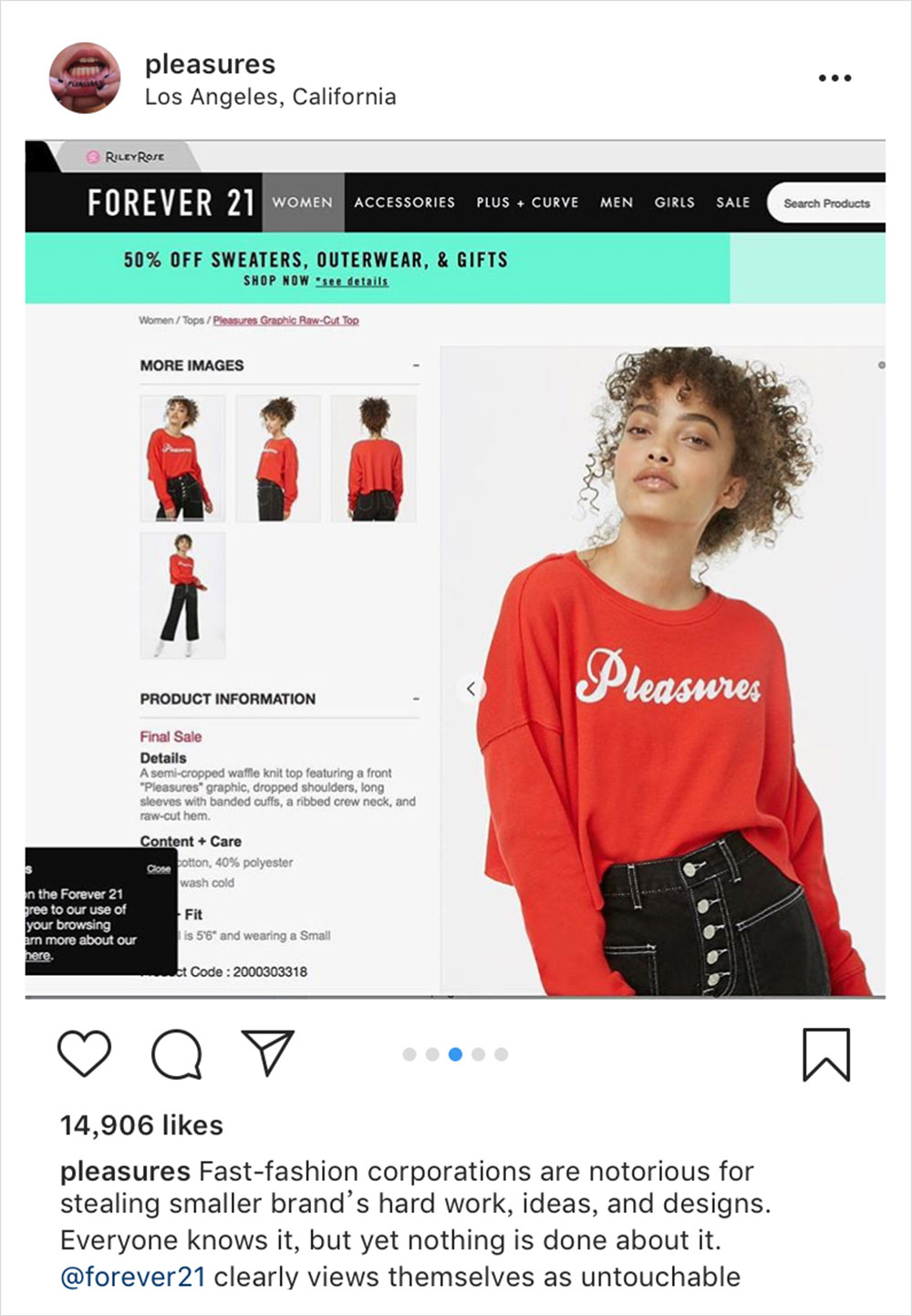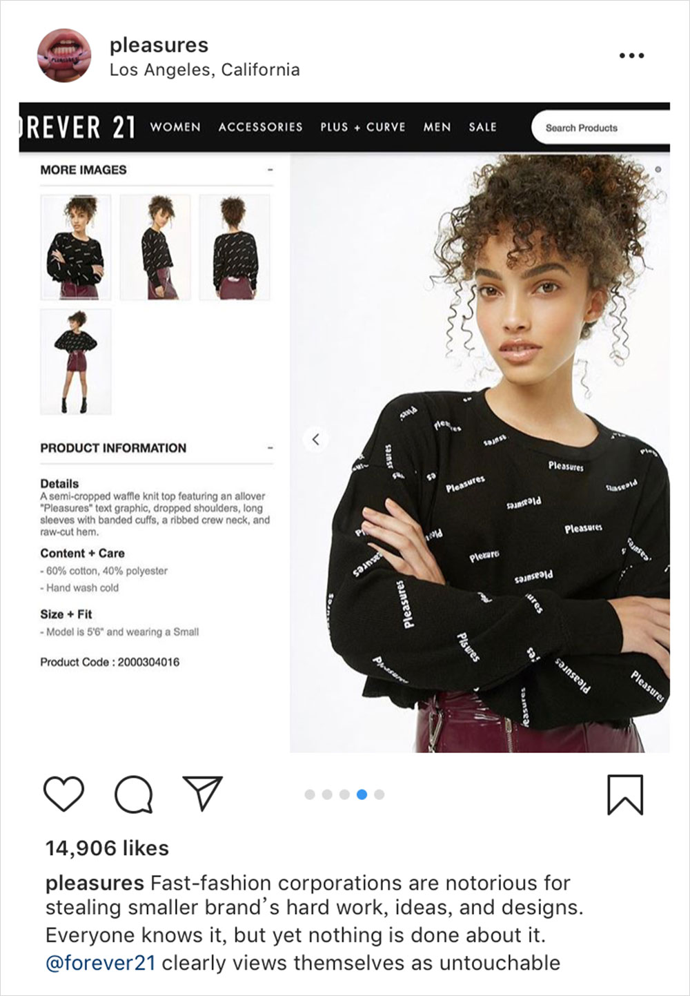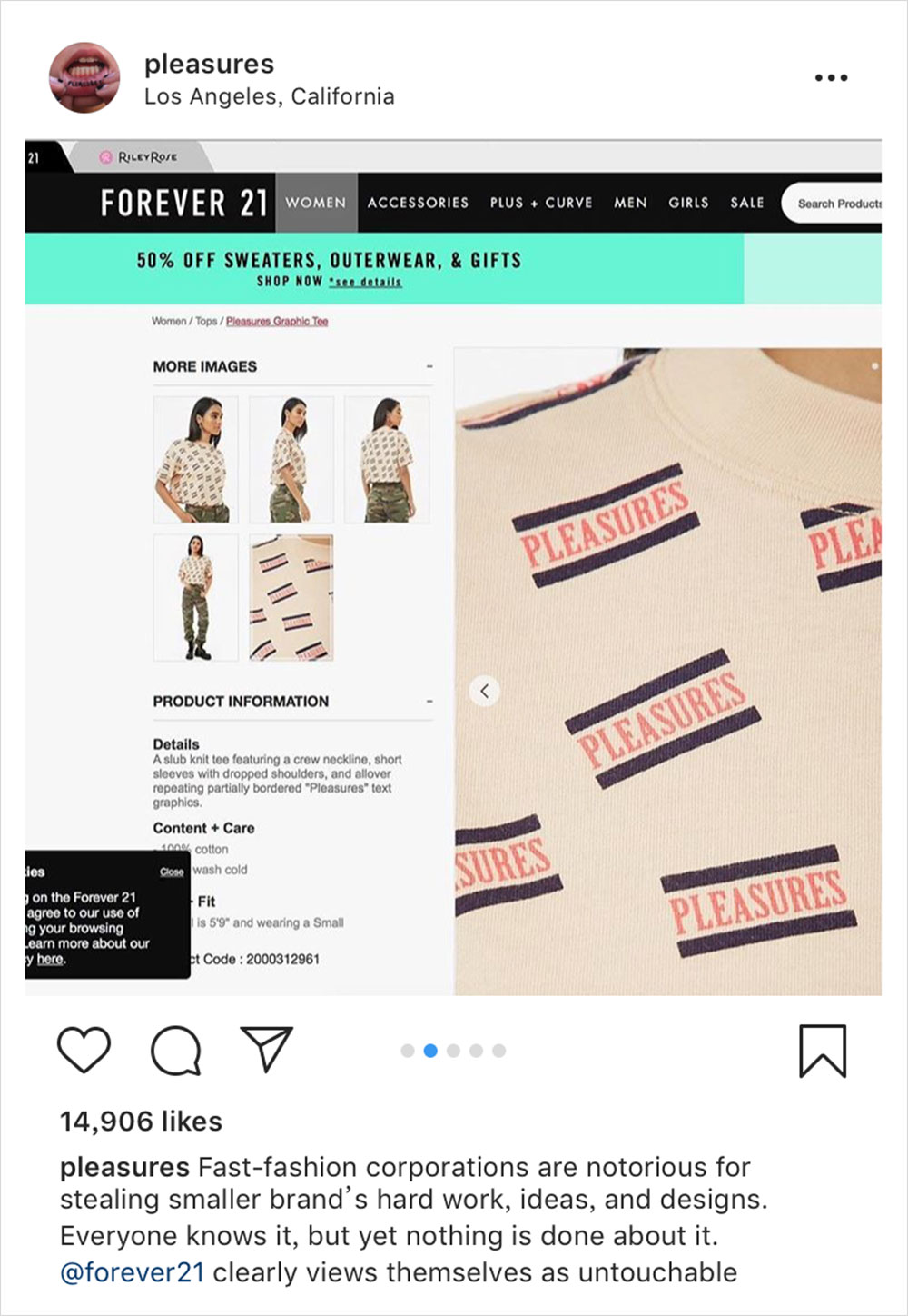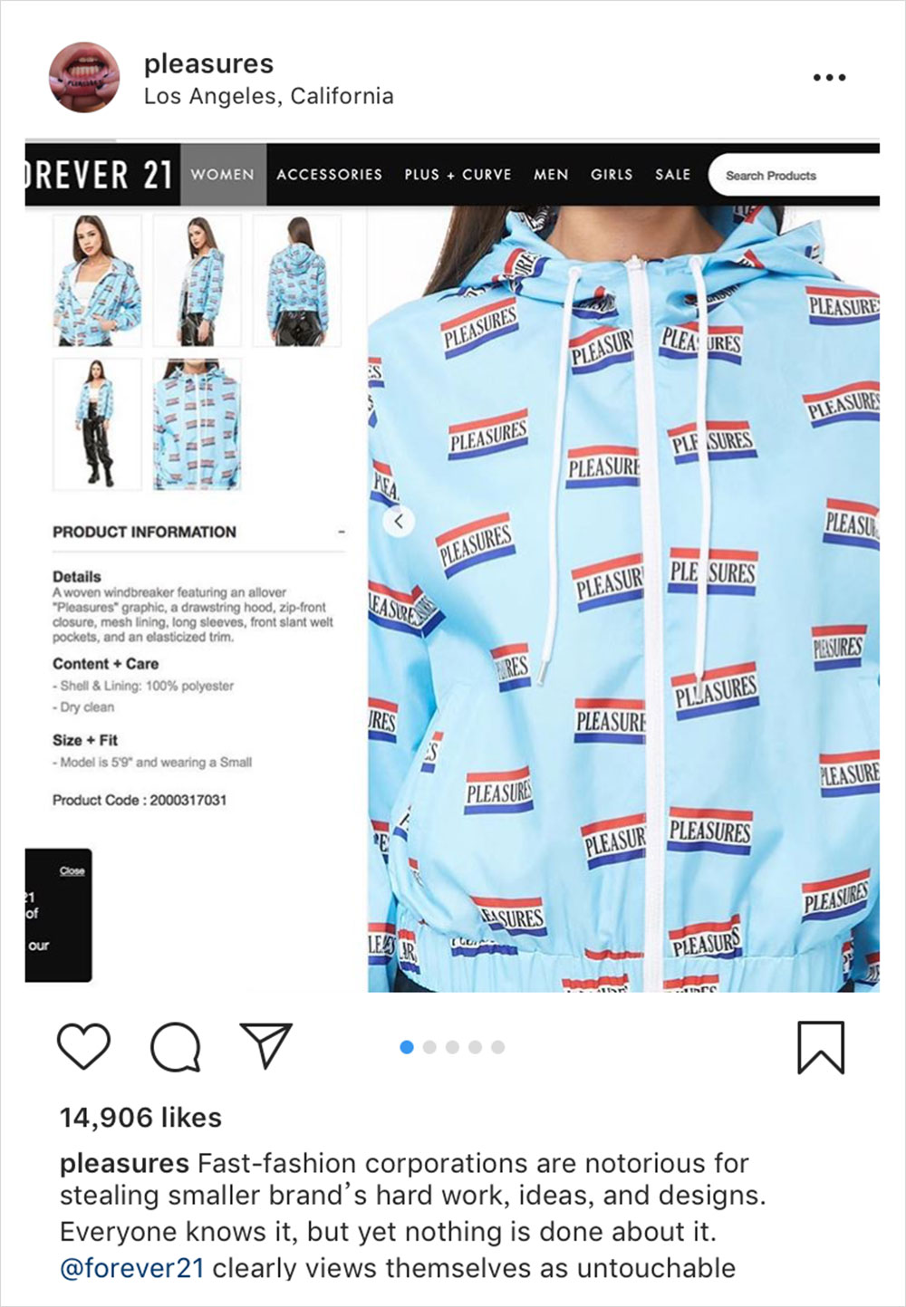 快时尚品牌从潮流品牌中窃取设计到自家单品已经不是什么很少见的事了,这种风气的魔爪今日也伸到了街头品牌 PLEASURES 身上。如图中所示,抄袭 “典范” FOREVER 21 直接将 PLEASURES 的 Logo 搬到了自家产品上,改都不带改的… 对此,PLEASURES 大吐苦水:FOREVER 21 显然认为自己是不可撼动的,因为他们总是从各品牌那窃取设计,从不怕被起诉或遭到反对。但这么明目张胆的抄袭并没有影响他们的业务,能改变此状况的往往是消费者,所以我们请求你们的帮助,不要让 FOREVER 21 侥幸逃脱,让他们知道消费者对这个现象的抵触。