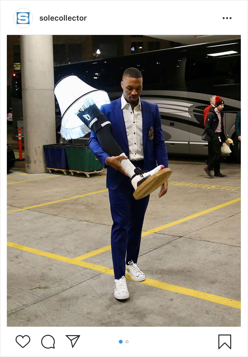 效力于开拓者队的 NBA 球星达米恩·利拉德今日的一身搭配在网上引起了一番关注,如你所见,利拉德穿的还正常些,就是手里拿着的一款 “大腿灯” 看着有些瘆人… 其实利拉德这一番是在给 adidas 即将上市的鞋款 Dame 5 造势,可以看出这款台灯 “穿” 的就是这双鞋,据悉此造型的灵感来自于 1983 年的喜剧《A Christmas Story》,你们感觉如何?