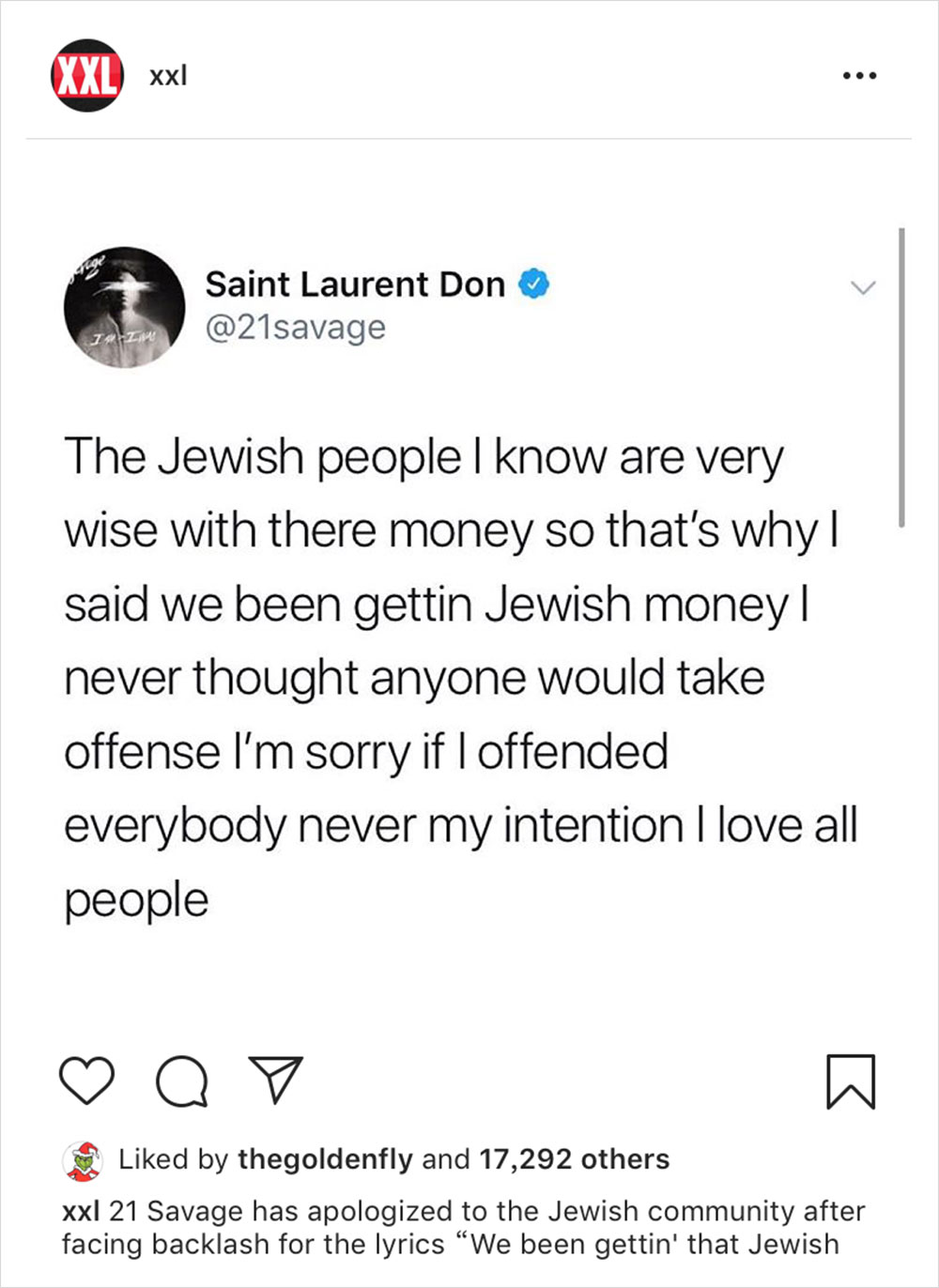 Lil Pump 前段时间在单曲中加入辱华词语这一事大家都知道了,而说唱歌手 21 Savage 近日也面临着一样的问题,在他前不久发布的歌曲《ASMR》中,就有着涉及了针对犹太人的内容:We been getting that Jewish money, Everything is Kosher 。看完大家可能不太理解,但总所周知,世界上众多优秀人士都是犹太人,所以 “犹太人很有钱” 就成了一种这个种族积极的刻板印象,但同时也为纳粹的反犹太主义提供了一个理由。前不久 LeBron James 在 Instagram 上引用了这一句歌词,从而遭到多数人的批评,为避免事件的影响进一步扩大,词作者 21 Savage 及时发出了道歉声明,表达了自己的无意冒犯。对比 Lil Pump ,不得不说 21 Savage 才是真的 Peace 。