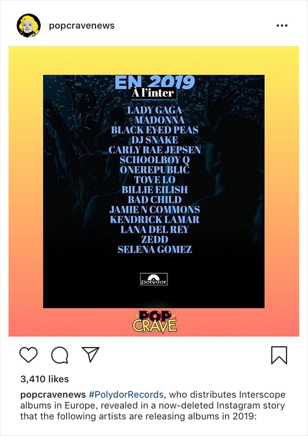 Interscope 旗下欧洲唱片发行公司 Polydor Records Records 日前公布了 2019 年将要出版专辑的艺人清单。其中就包含了在 2017 年凭借《DAMN》荣获众多奖项的 Kendrick Lamar ,除此之外 Black Eyed Peas, 、ScHoolboy Q 、Lady Gaga 、 Selena Gomez 等歌手也赫然在列,这意味着大家将在新的一年听到两位 Top Dawg Entertainment 厂牌成员的新作,一起期待吧。