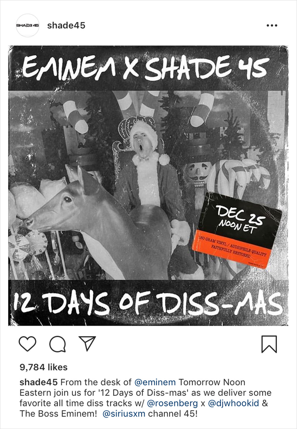 早前 Eminem 曾发推告示,会精选 12 首 Diss 歌曲作为给粉丝们的圣诞礼物,倍感期待的同时也不禁好奇,Diss 大神都喜欢哪些 Diss Track 呢?节日当天他便在电台 Shade 45 中将这些歌曲发布了出来,分别是:
