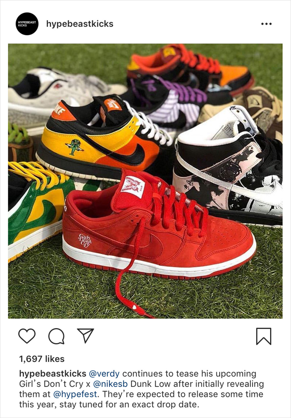 早在去年 10 月份的 HYPEFEST 上,日本艺术家 Verdy 就展示了个人所主理品牌 Girls Don’t Cry 和 Nike 合作的 SB Dunk Low 鞋款,当时便有消息称会在去年发布,尽管大家并没在 2018 等到这双鞋… 日前 Verdy 继续给联名造势,晒出新的鞋款实照,相信离正式发布也不会太久了。