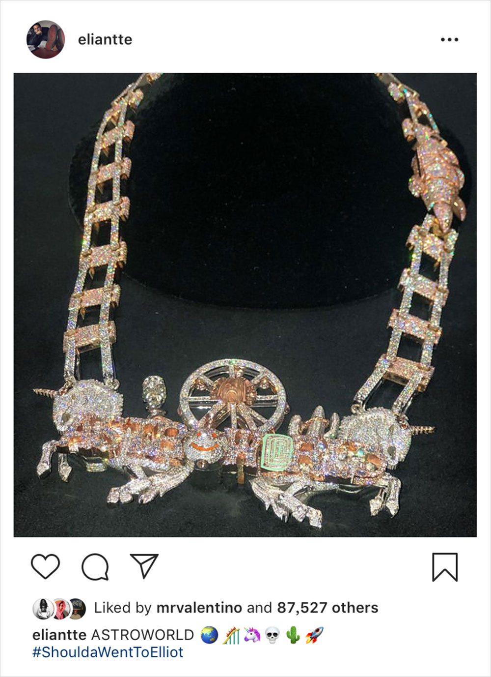 “新巨星” Travis Scott 于不久前开展了巡演 “Astroworld” ,如果你有在 Instagram 上关注这个演唱会动态的话,会发现现场的布置创意十足,这一点从 Travis 在演唱会搭建了一个小型火车来秀恩爱就知道了… 这也还只是其中一点,近日,珠宝定制师 Eliantte 就根据 “Astroworld” 的布景,制作了一条项链,火车轨、独角兽、骷髅头以及仙人掌等元素,都很好的表达 Travis 演唱会的科幻。但这番奢华的制作,价格也可想而知了…