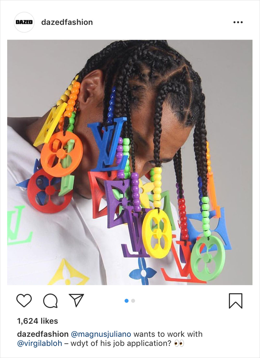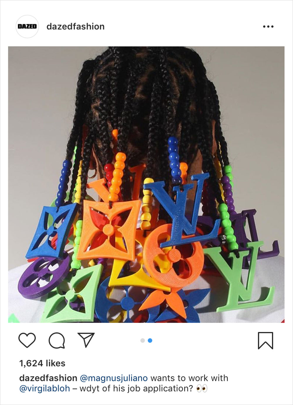 老牌时装屋 Louis Vuitton 除了自家单品备受热捧外,其品牌 Logo 和形象也是时尚玩家们热衷 DIY 的元素。今日 Instagram 上 @magnusjuliano 就以 LV 的 Logo 作配饰,装配在自己的脏辫末尾,以十分抢眼的造型特色在网络上火了一把,并调侃了一下 Virgil :“我够格到你手底下实习吗?” 虽说是特色十足,但带着这么多配饰,脖子不累吗…