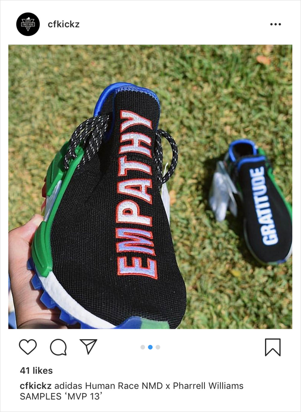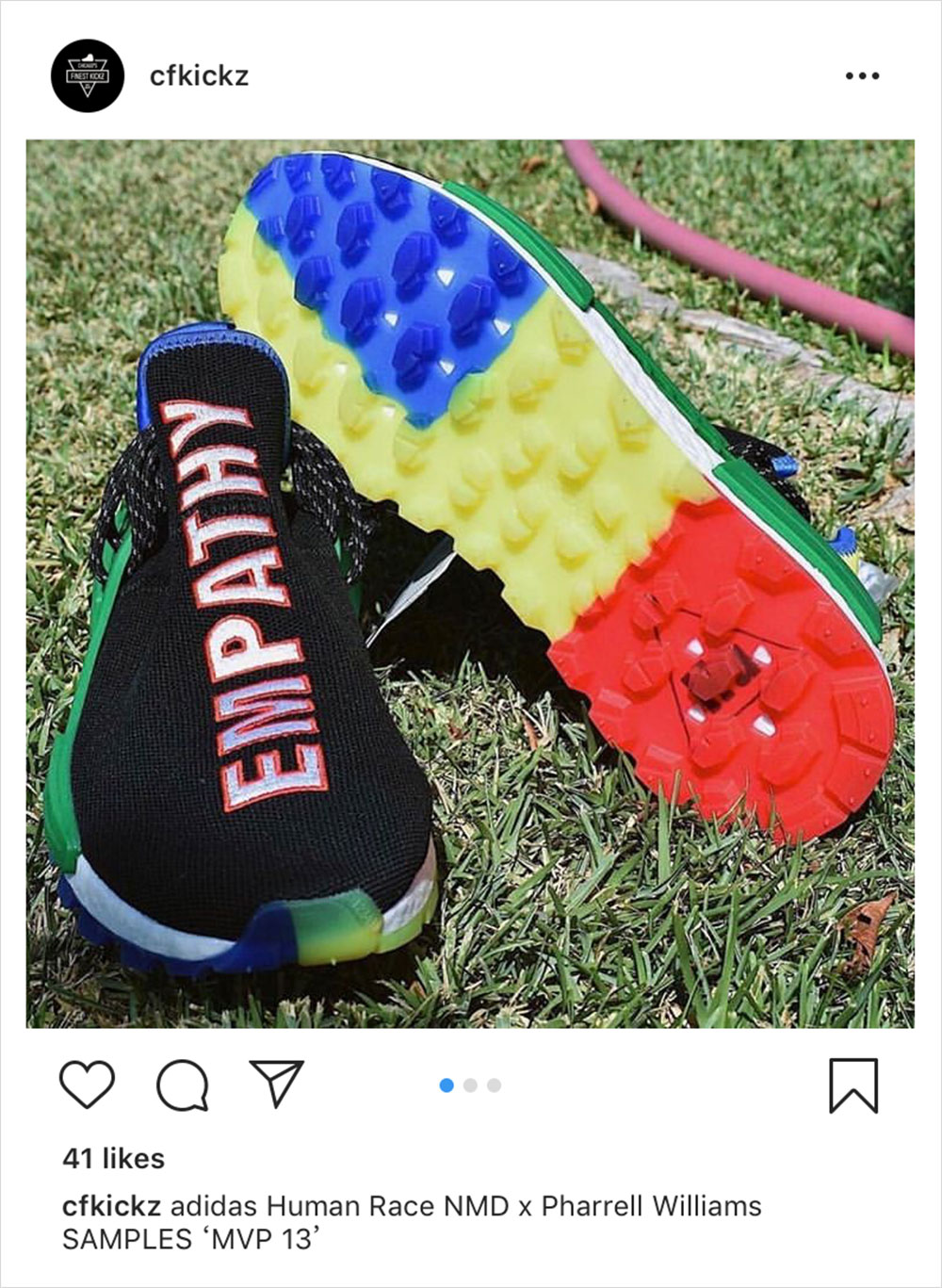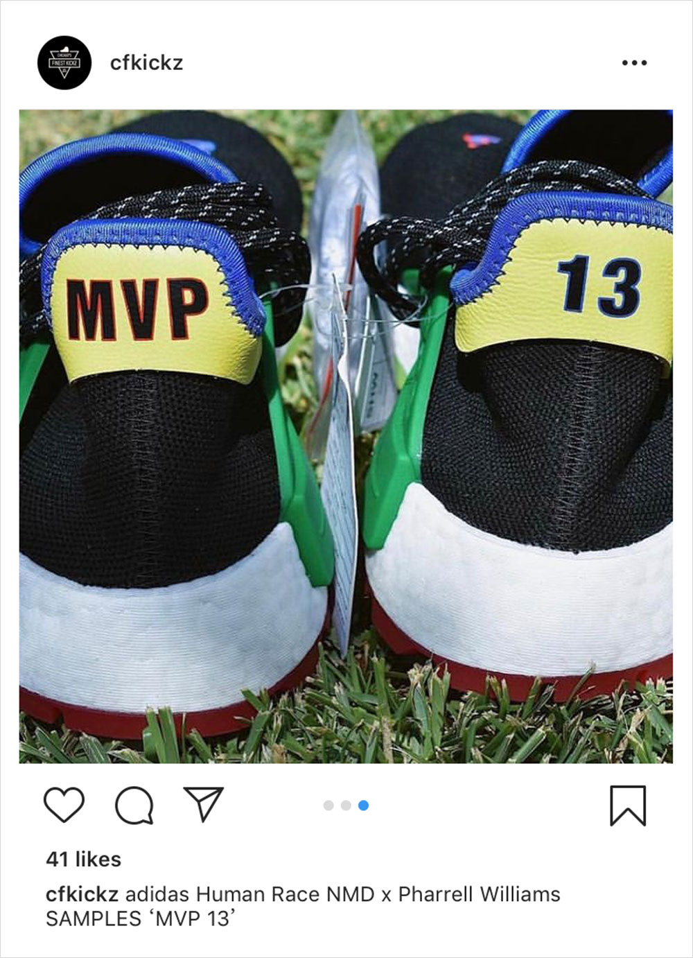 在去年的 NBA 17-18 赛季颁奖典礼上,Harden 当选了赛季常规赛 MVP 球员,为此 Pharrell Williams 特地为其打造了一双鞋舌上印有 “MVP 13” 字样的 Crazy BYW PW 。但今日来看,Pharrell 对 Harden 的致敬不止这一双球鞋。在情报账号 @cfkickz 今日曝出的 adidas Human Race NMD 新款 Sample 中,鞋跟处也有着 “MVP 13” 的字样,所以综合过往,难道这又是一双 Harden 专属?