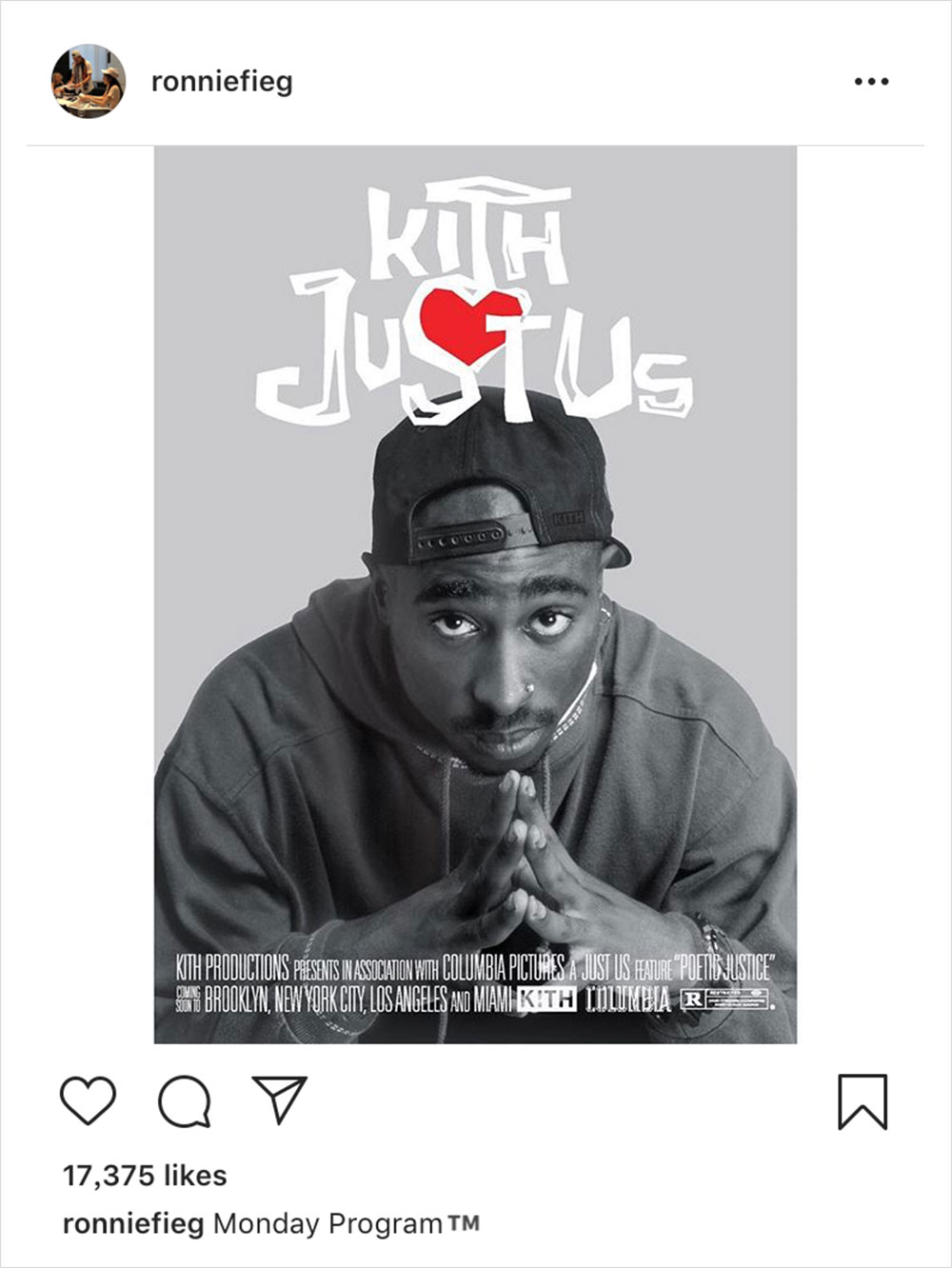 在音乐领域,2Pac 是人人尊重的传奇人物,而在潮流文化中,也有不少品牌会推出以他为主题的单品,表达敬意。今日就连 KITH 也要来 “致敬” 一把,主理人 Ronnie Fieg 日前发布了下周 “Monday Program” 的宣传海报,我们熟悉的 2Pac 形象贯穿其中,而顶部的 “Kith Justus” 字样则与 2Pac 生前与 Janet Jackson 共同主演的电影《Poetic Justice》Logo 十分相像,所以不难猜测 KITH 新的系列也许会以该片为主题,大家敬请期待。