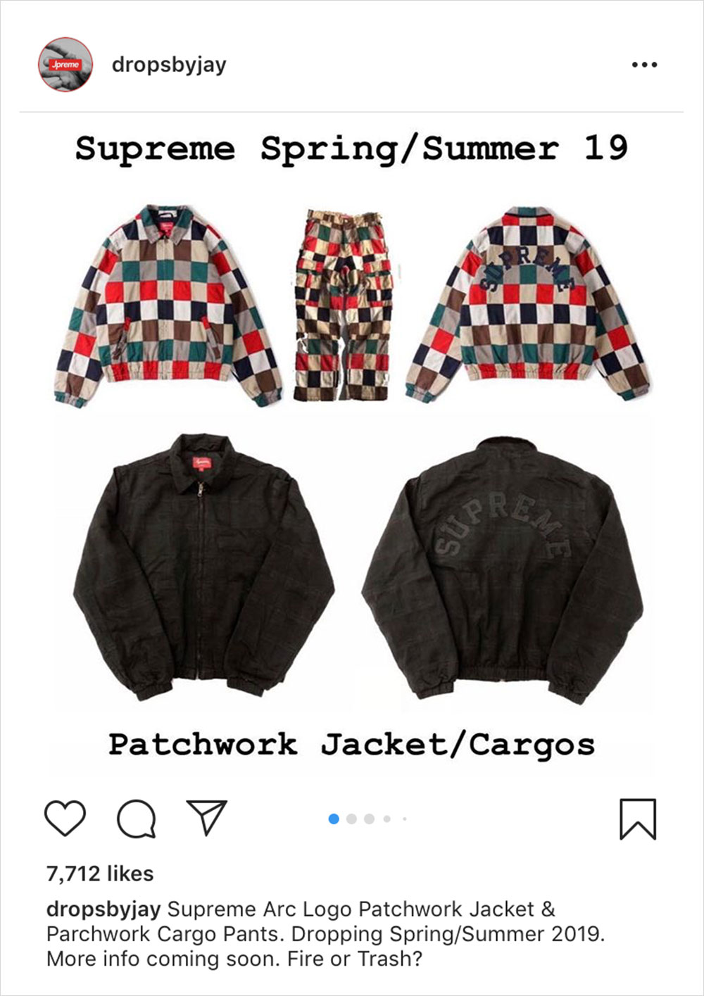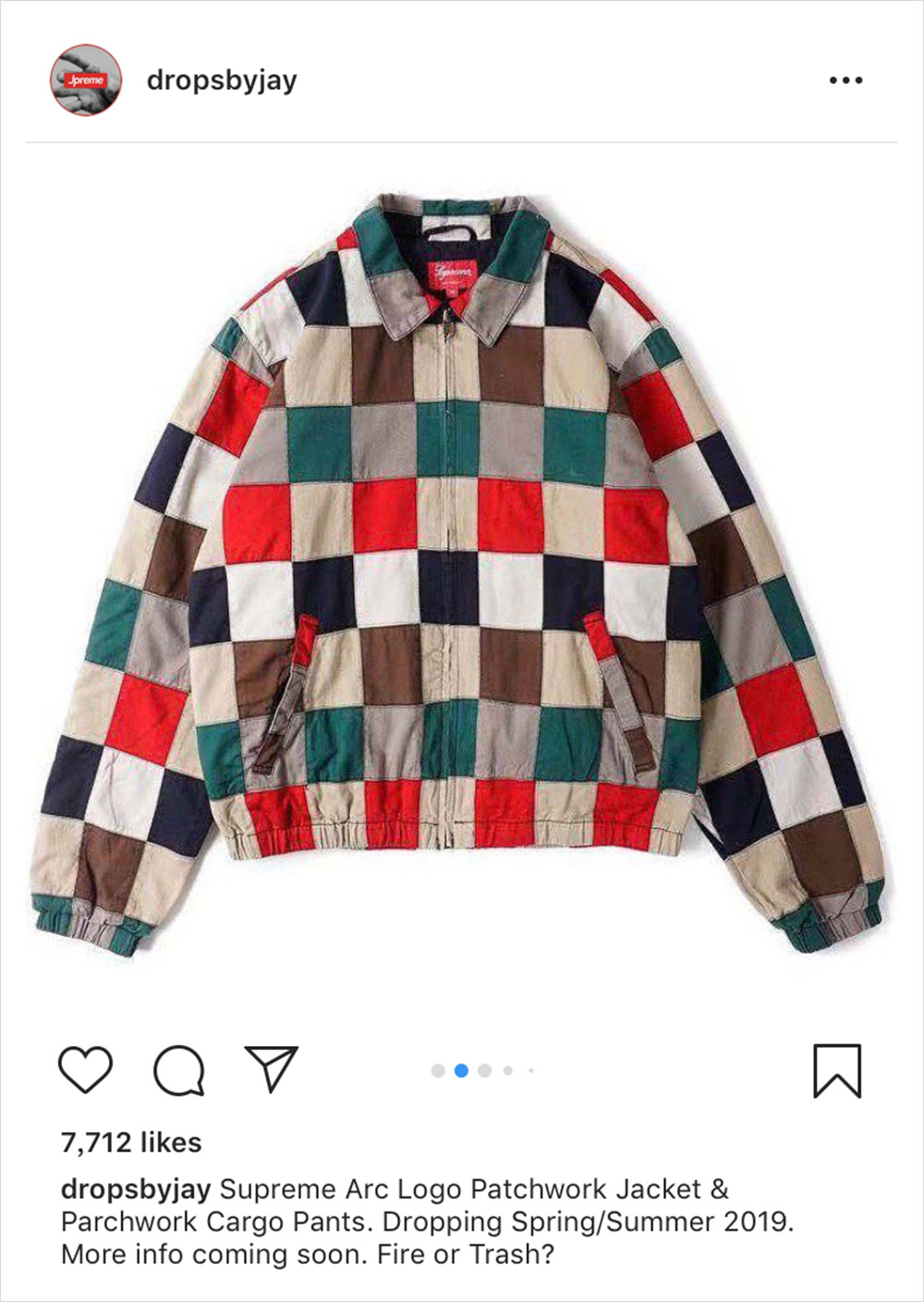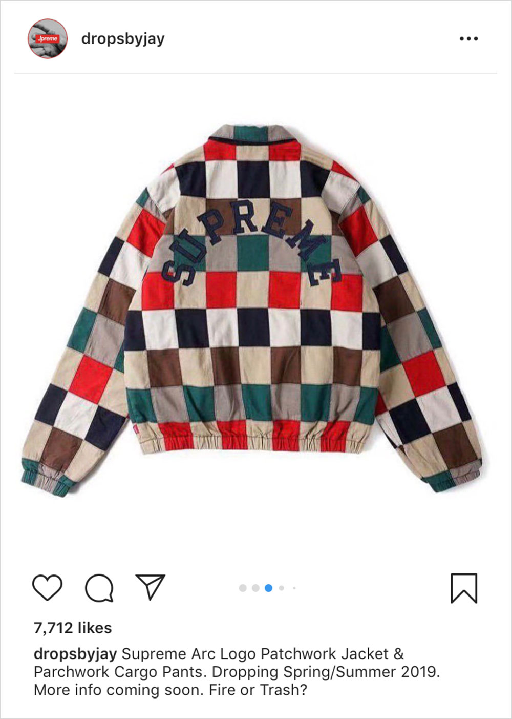 虽然目前离 Supreme 2019 春夏系列的发布还有一个多月,但外媒 @dropsbyjay 今日提前给我们曝光了该系列的单品图片。如图所示,春夏系列包含了一款格子拼接套装,Supreme 字样以弧形 Logo 呈现于夹克背面,风格尽显复古。除了单品,该账号同时还曝出了发布计划,正式预告是 2 月 4 日,而第一波的发售是同月 14 日,想及时了解就持续关注我们的报道吧。