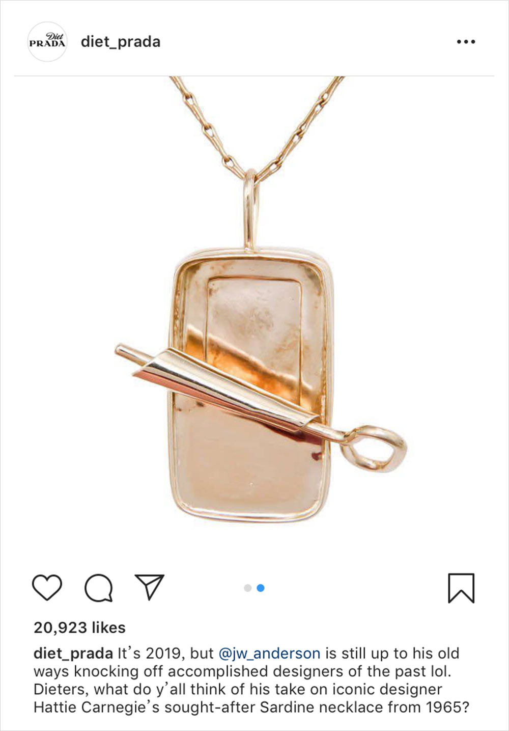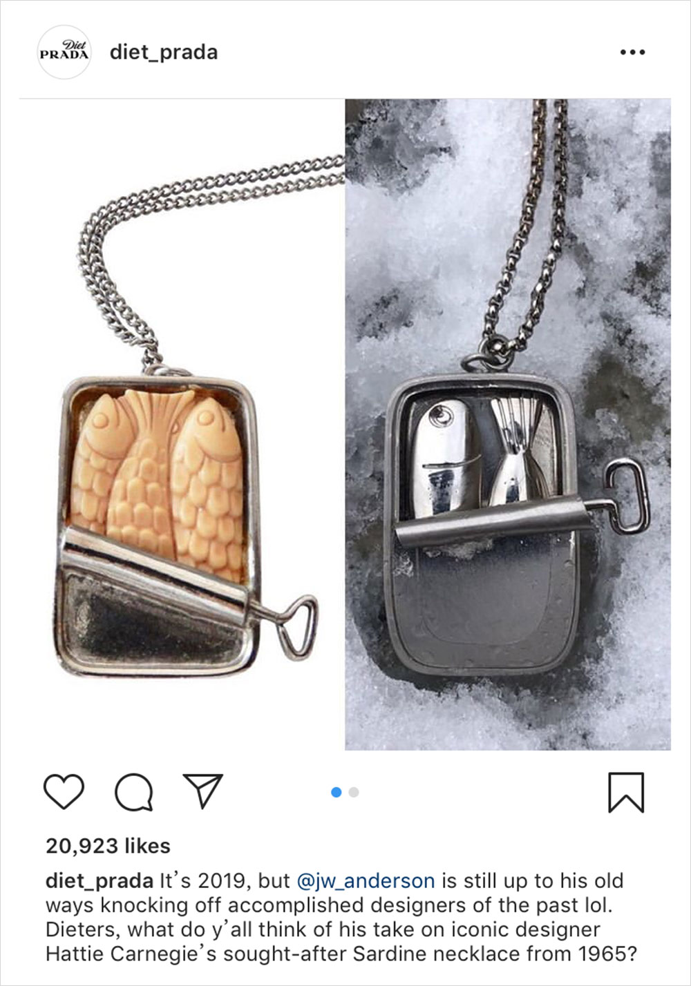 经常有一些品牌的设计往往来自于年份久远的单品,我们也报道了不少这样的事例,是否论定 “抄袭” 之名,就看大家怎么看待了。今日,就连 J.W. Anderson 也被时尚警察 @diet_prada 扒出干过这样的事儿。图左为知名珠宝设计师 Hattie Carnegie 在上世纪 60 年代推出的项链配饰,与图右的 J.W. Anderson 的单品对比,你很难说两者之间没有联系,就连 Cartier 在 70 年代推出风格相似的单品,也没有做出鱼的部分,因为动物是 Hattie Carnegie 常常会用到的设计主题。当然,肯定不是所有人都会认定这是抄袭,但也别太像了吧…