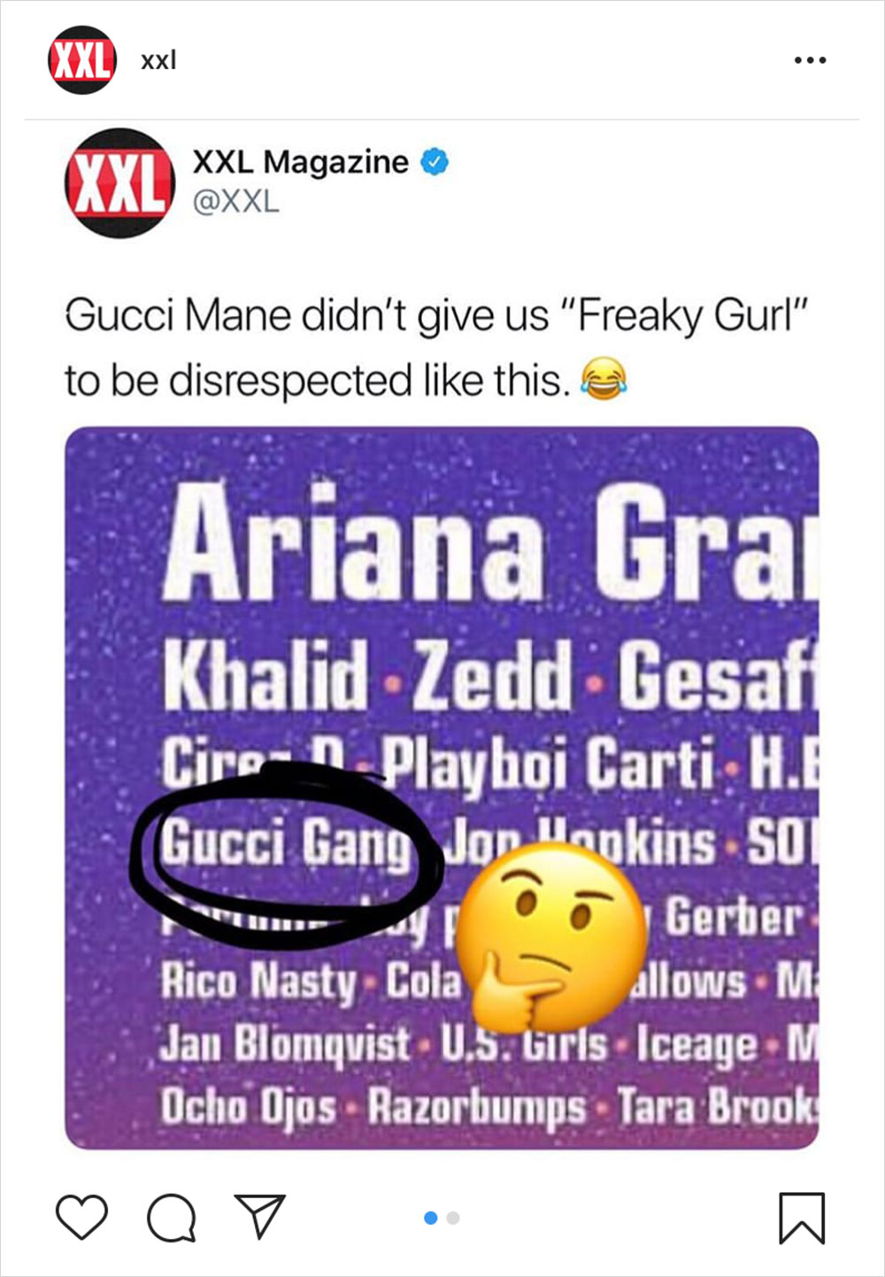 Coachella 音乐节在全球可以说是备受推崇的视听盛宴,日前官方也正式公布了 2019 年的嘉宾阵容,将在 4 月 12-14 日以及 4 月 19-21 日精彩上演。虽然 Kanye 因为限制原因拒绝出演,但也不影响演出阵容对粉丝们的吸引,比如 Childish Gambino、Tame Impala、A妹、Playboi Carti 、Gucci Gang… 等等,这个 “Gucci Gang” 是谁… 今日 Hip-Hop 权威杂志《XXL》就 “好奇” 的指出了 Coachella 阵名单上的一个小问题,因为大家都知道,《Gucci Gang》是一首歌的名字,难道是时下某个新人的名字?比起这一点,可能性最大的还是 Trap 大佬 Gucci Mane 被主办方写错了…你们觉得呢?