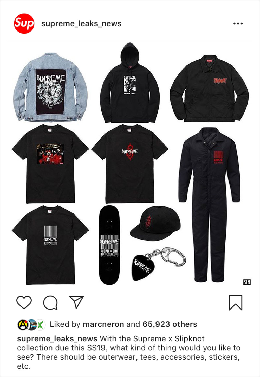 在上周的《墙外世界》中,我们报道了 Supreme 2019 春夏的部分单品,当然了,这些肯定还不能满足你们,这不,情报账号 @supreme_leaks_news 今日接力给我们曝光了这一季的联名。这一次 Supreme 找来的是美国重金属乐队 Slipknot ,他们一直以独特的音乐风格及暴力血腥的疯狂演出模式而闻名,同时也受到了众多年轻人的追捧。该系列包含了牛仔夹克、帽衫、短 Tee 、板面及多款配件,快过年了,压岁钱知道怎么花了吧?
