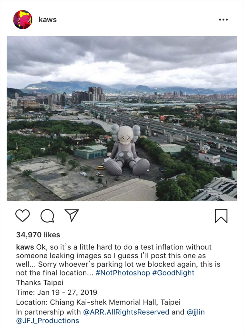 去年 KAWS 于韩国首尔举办了第一站《KAWS:HOLIDAY》展览,在当时的前期准备工作中,总长 28 米的 COMPANION 充气雕塑占据了一个停车场… 而即将在台北展出的坐姿 COMPANION 更是达到了 36 米的总长,从图中实物和周围事物的比例对比可以明显感觉到此次 COMPANION 的庞大体积,势必成为当地一道亮丽的风景线,所以看完后… 是不是有了想 “杀去” 台北的冲动?