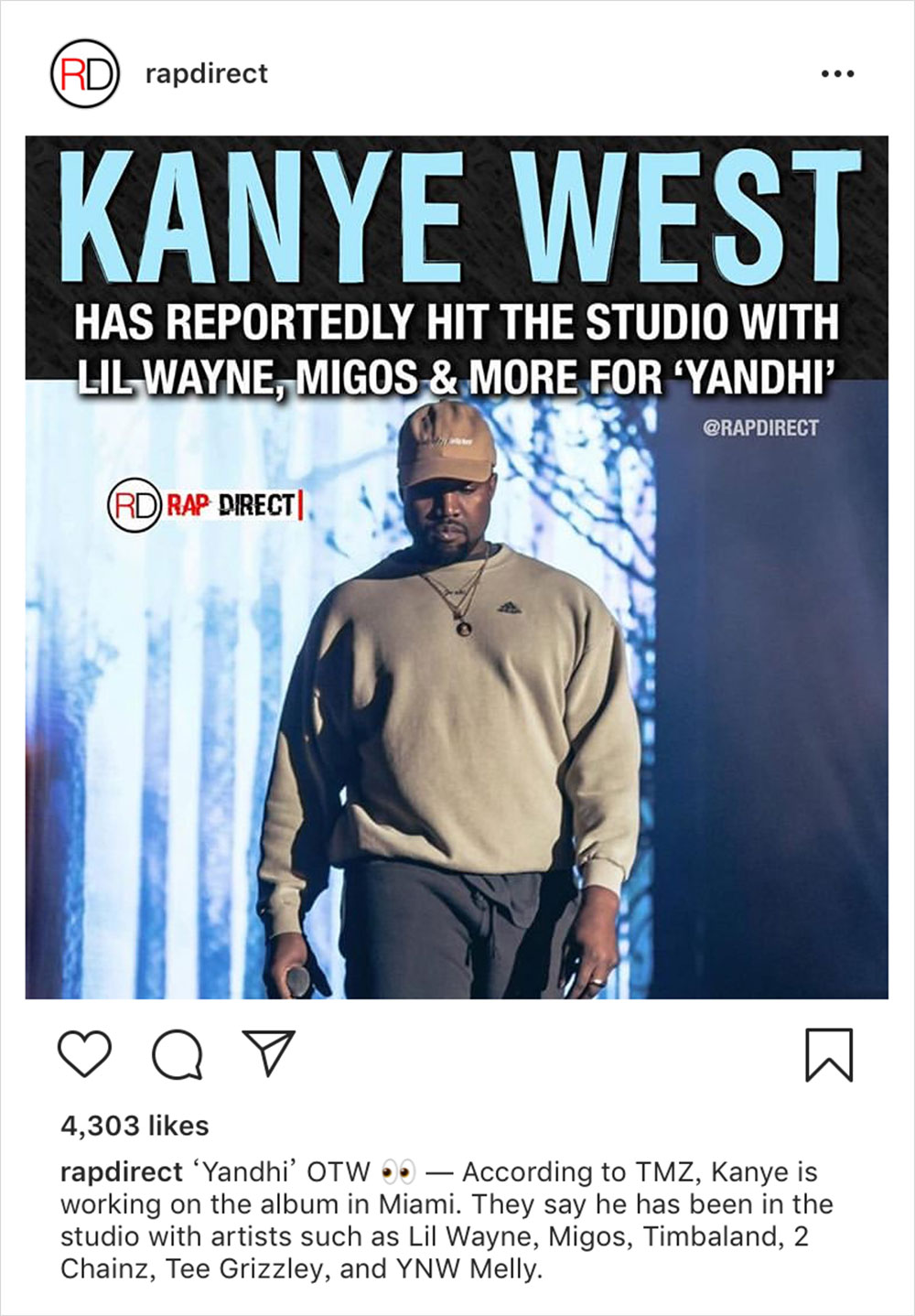 Kanye West 新专辑目前正在制作当中,虽说还没有明确的发布时间和专辑内容,但 TMZ 今日曝光了 Kanye 新专辑的 Featuring 阵容。分别是 Lil Wayne 、Migos 、Timbaland 、2 Chainz 以及新秀 Tee Grizzley 和 YNW Melly ,阵容相当豪华,保持期待吧。