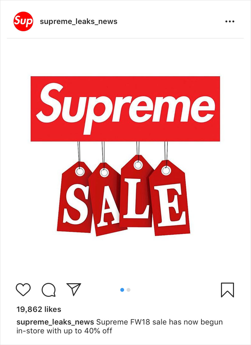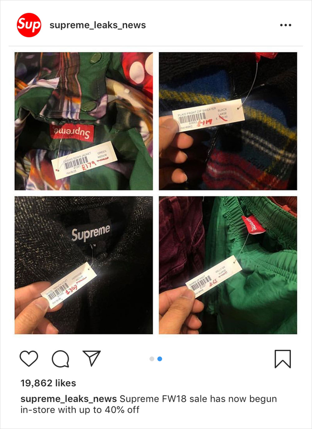 如果你想在新年给自己置办一身新的行头,Supreme 想必是大多数人钟意的品牌选择,尤其现在正值冬季,2018 年的秋冬款最适合不过。所以现在你们的机会来了!情报账号 @supreme_leaks_news 今日透出,Supreme 门店目前正在做 “打折促销” 活动,主要 “清仓” 2018 的秋冬季产品,并且 4 折起… 如此力度的折扣,还不赶紧联系自己的海淘资源?