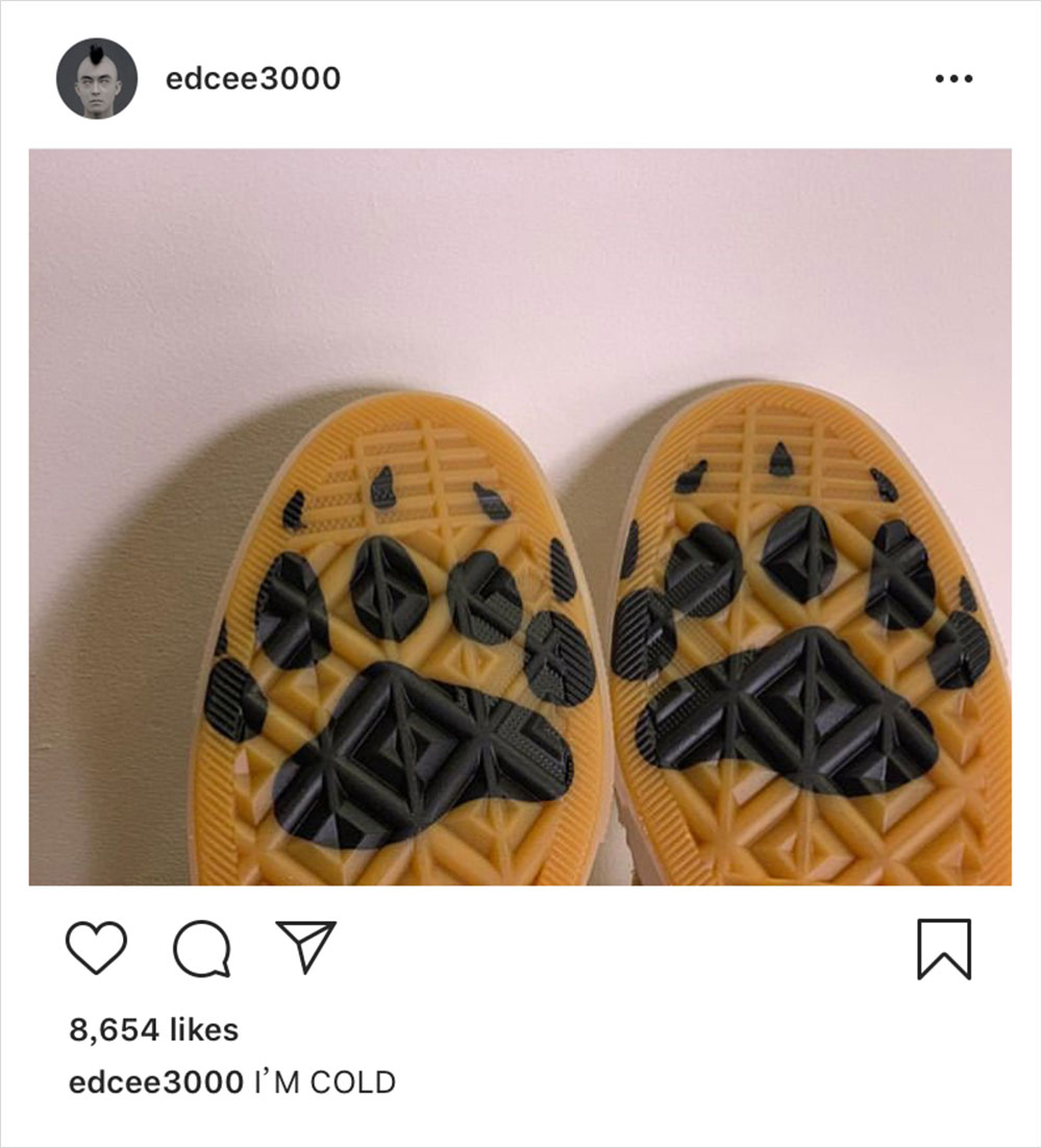 “兵马俑” 在去年年末无疑是引起了一番热度,而在新的一年里,陈冠希也开始给自己新的联名预热造势。如图中所示,虽然冠希哥只晒出了鞋底,但眼尖的朋友可能一下子就认出来,这不是 @dirtymoney823 早前曝光过的 CLOT x CONVERSE 联名鞋款吗?也难怪冠希哥会附文 “I ‘M COLD” 了,鞋身黑、白、棕 3 色拼接的绒毛设计,简直就是抗寒利器,除外,“熊爪” 印面鞋底、透明质感的中底以及鞋后跟拉链等也是趣味且实用的设计。据悉鞋款会在月底发售,拭目以待吧。