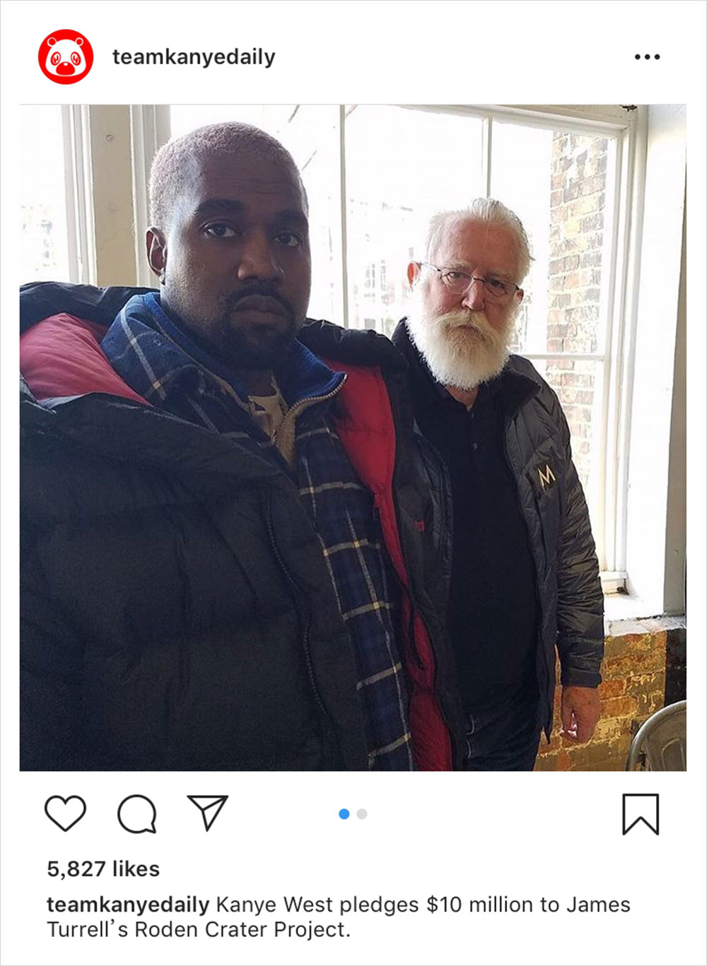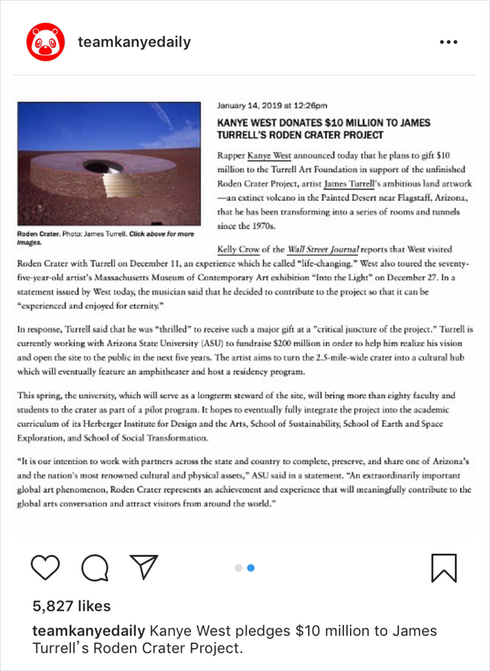 也许是和 Turrell 相处的几天里,Kanye 被对方的艺术思维折服了,在今日决定向 Turrell 的艺术基金会捐赠 1000 万美元,助力完成 “Roden Crater” 这个艺术项目。Turrell 称这笔钱是 “雪中送碳” ,计划在 5 年内开放这个作品,Kanye 也在捐款声明中提到,希望 “Roden Crater” 能被世人 “永远的享受” 。Kanye 对艺术的推波助澜自然是值得称赞,但对 James Turrell 不了解的朋友也许不会一下就明白这个作品的价值,这么说吧,Drake 曾经风靡全球的热单《Hotline Bling》MV 灵感,就来源于他的光学艺术(这对冤家对艺术的品味倒是蛮相像的)。