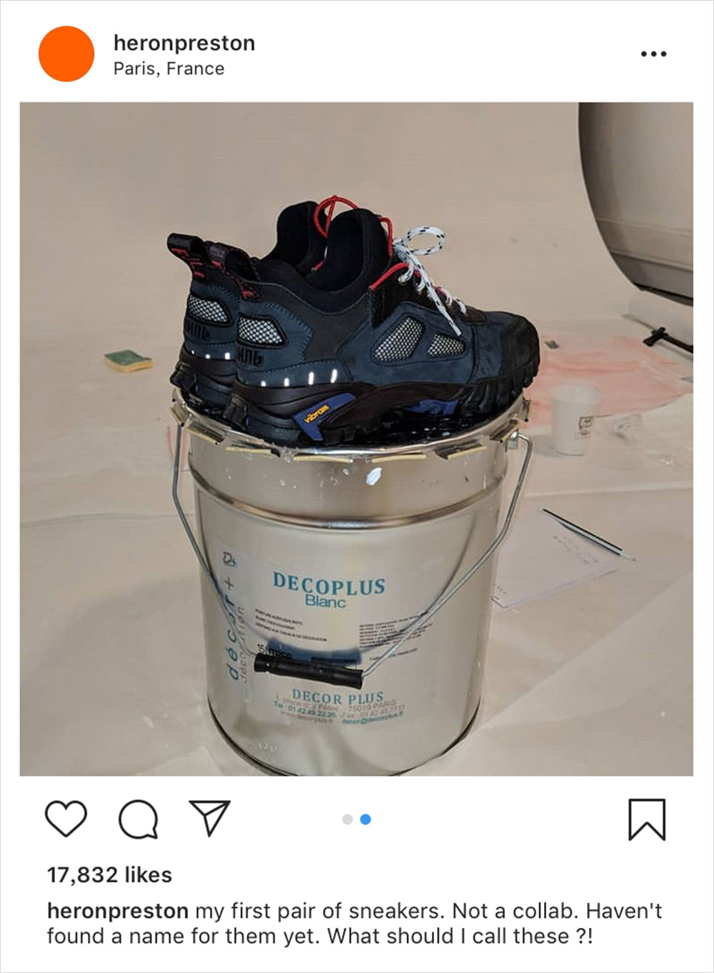 看来 Heron Preston 在宣告即将出展巴黎时装周之后,就全身心地投入到筹备工作当中了,今日还曝光了品牌的第一双运动鞋款。看到鞋款的第一眼有些登山鞋的既视感,其整体设计也是迎合了当下流行的 Chunky Sneaker 风潮,预计也是会在时装周亮相的单品之一,有趣的是,Heron Preston 本人还不知道应该给这双鞋取什么名字,所以… 喜欢的朋友还是密切关注我们的后续报道吧。