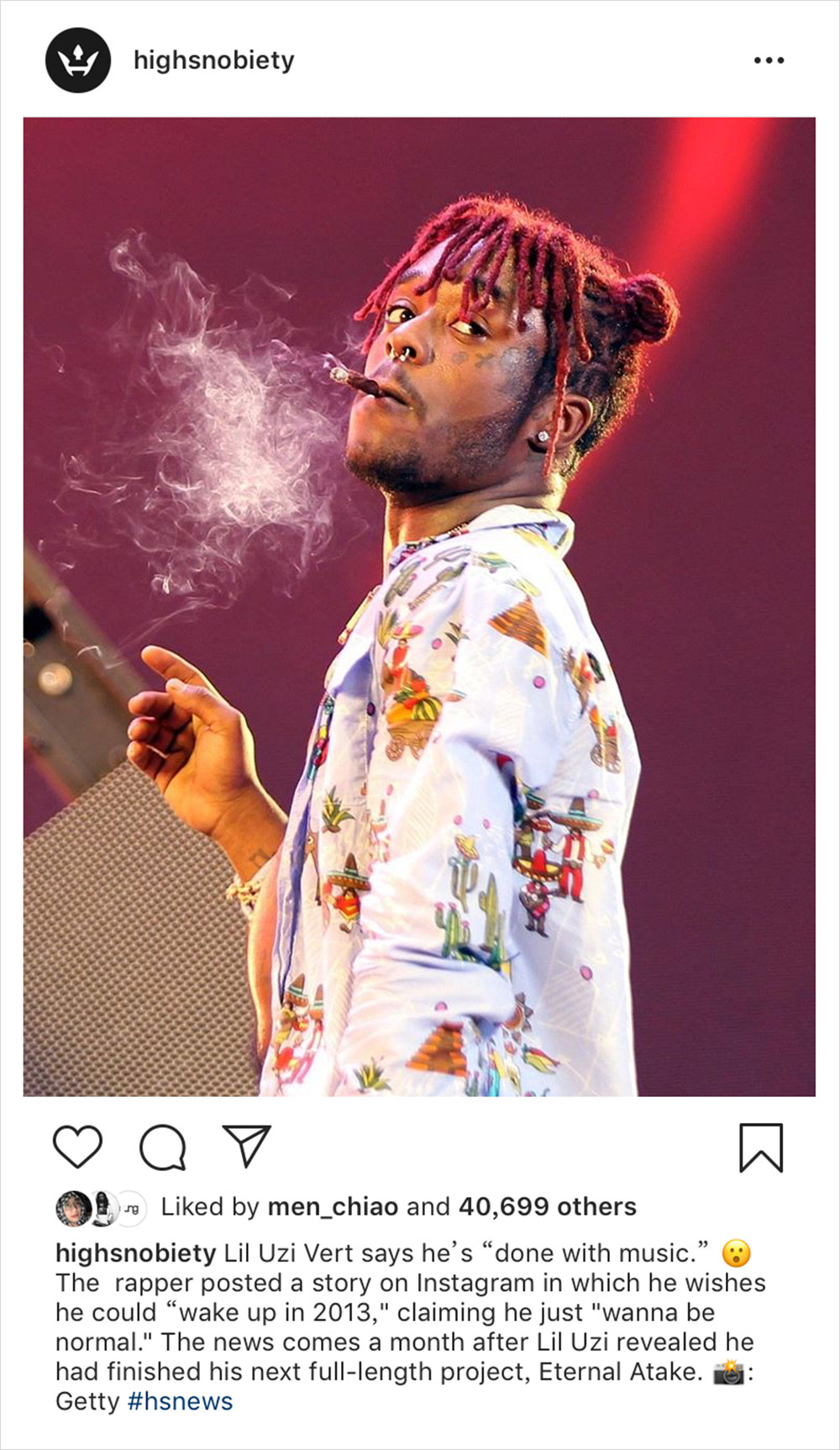 早在去年年末,就有消息透出我们即将迎来 Lil Uzi 的新专辑《Eternal Atake》,然而专辑还没到,等来的却是他 “金盆洗手” 的宣言:“我已经受够了音乐,我删除了所有的作品,想过回正常的生活” 。据悉,这只是 Lil Uzi 和唱片公司紧张关系的表现,早前他就曾公开表示了对厂牌 Generation Now 的不满,所以粉丝们也别担心,多的是说唱歌手说过要 “退圈” 的言论… 这不,Lil Uzi 今日就对此进行了解释:“我所能做的就是创作音乐,但你要知道,当人们逐渐不喜欢你的时候,你还签了一个傻* 的公司… 那样能有什么好结果?” 帖子最后,他用 “出狱” 说了自己下一步的动态,所以粉丝们想要听到新专辑,也许得等到 Lil Uzi 换新公司了。