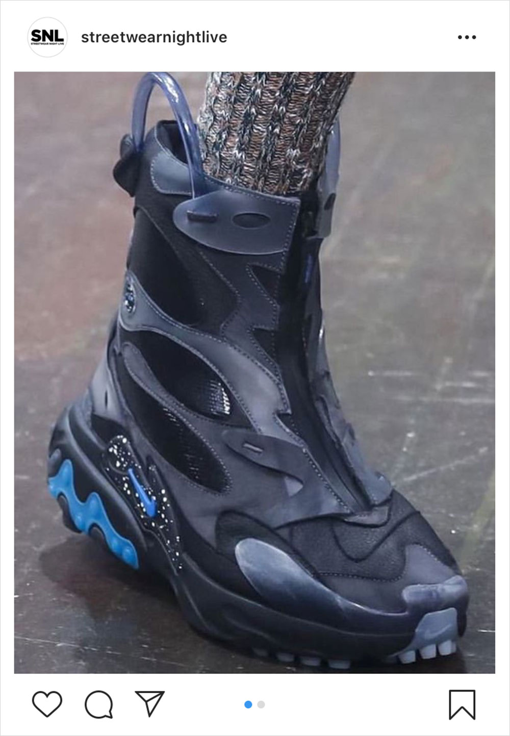 自从去年 UNDERCOVER 在 2018 秋冬走秀上亮相了与 Nike 的联名鞋 React Element 87 之后,这双鞋也是一经发售就遭哄抢,成了去年的热门鞋款之一。而在 UNDERCOVER 刚结束的 2019 秋冬秀场 “A Clockwork Orange” 上,新的 Nike 联名款也得以亮相。联名鞋共有两款,其中一双以 Air Max 720S 为蓝本来进行鞋面上的颜色改造, 另一双的鞋型在设计上就较为多变,选用了看似 ACG 的多层镶板配以机能的鞋舌拉链,同时搭载 React Element 的中底组合成一个靴履产品。无疑,高桥盾给巴黎交了一份满意的作品,但同时,也是一个掏空钱包的设计…